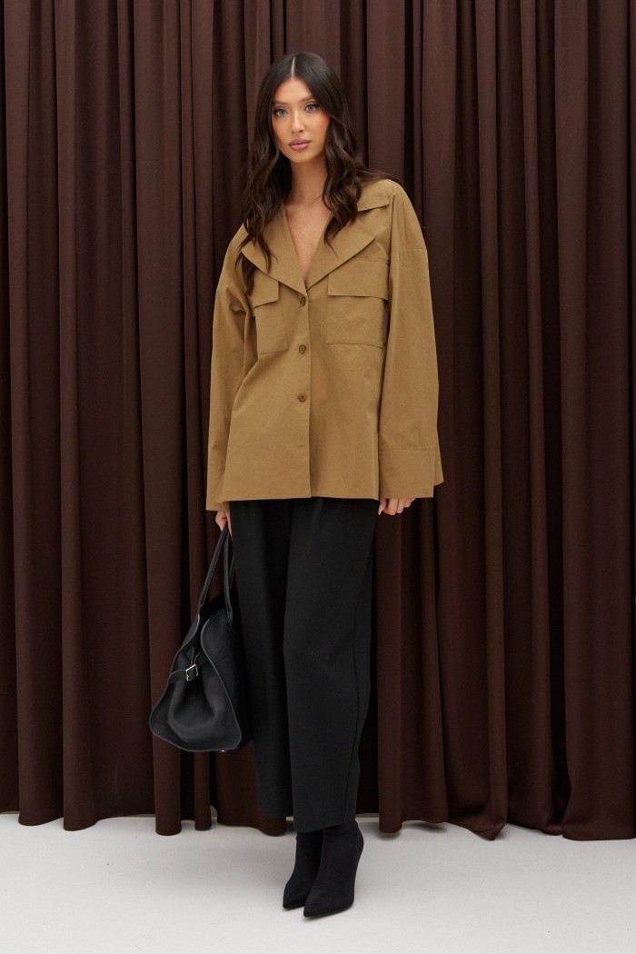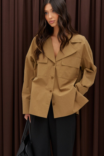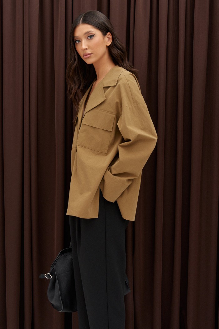Блузка прямого свободного кроя выполнена из хлопка цвета хаки. Характеристики: Прямой крой, воротник пиджачного типа, функциональные накладные карманы по переду изделия, разрезы в боковых швах. Рукав втачной, немного спущен, по низу рукава широкий манжет. Длина по спинке 69 см, длина рукава от горловины 76 см