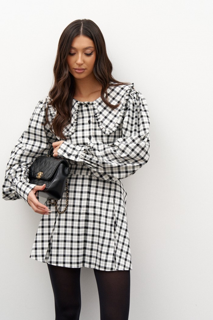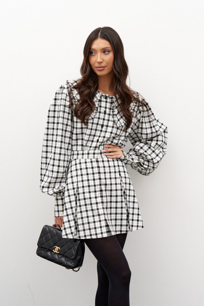 Блузка прямого свободного кроя выполнена из хлопкового полотна в черно-белую клетку. Характеристики: горловина овальный вырез вырез, воротник крупный, украен оборками, застежка центральная на пуговицах. Рукав широкий втачной со сборкой, внизу манжет на две пуговицы. Длина по спинке 59 см, длина рукава 73 см.