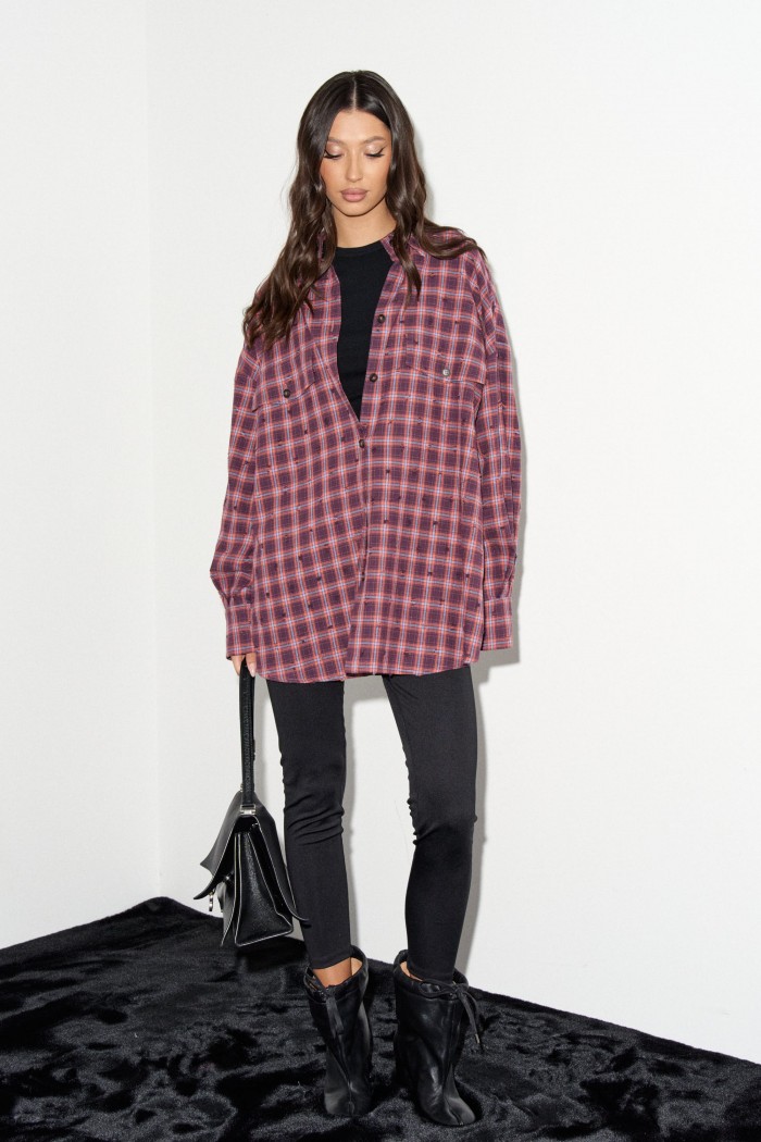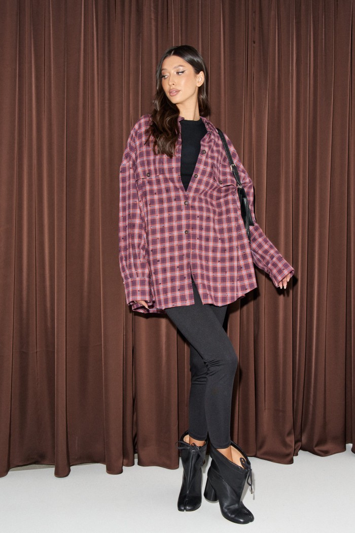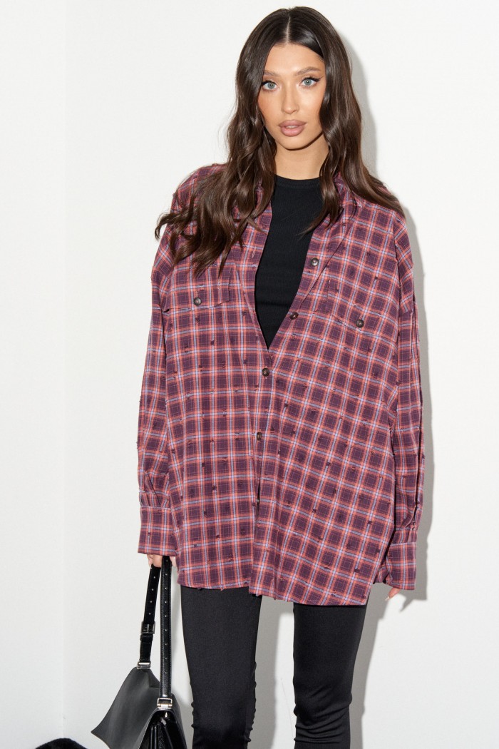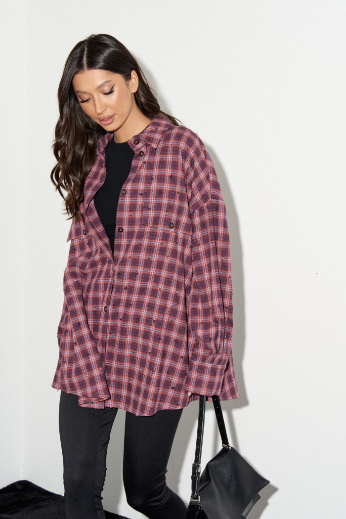 Рубашка прямого свободного кроя. Выполнена из фланели с эффектом потёртости. Воротник отложной. Застёжка центральная на пуговицы. По переду на уровне линии груди клапаны - имитация карманов. Рукав спущенный, свободный, с манжетой на пуговице. Длина рукава от линии втачивания 53 см. Спинка отрезная со сборкой. Длина спинки 76 см