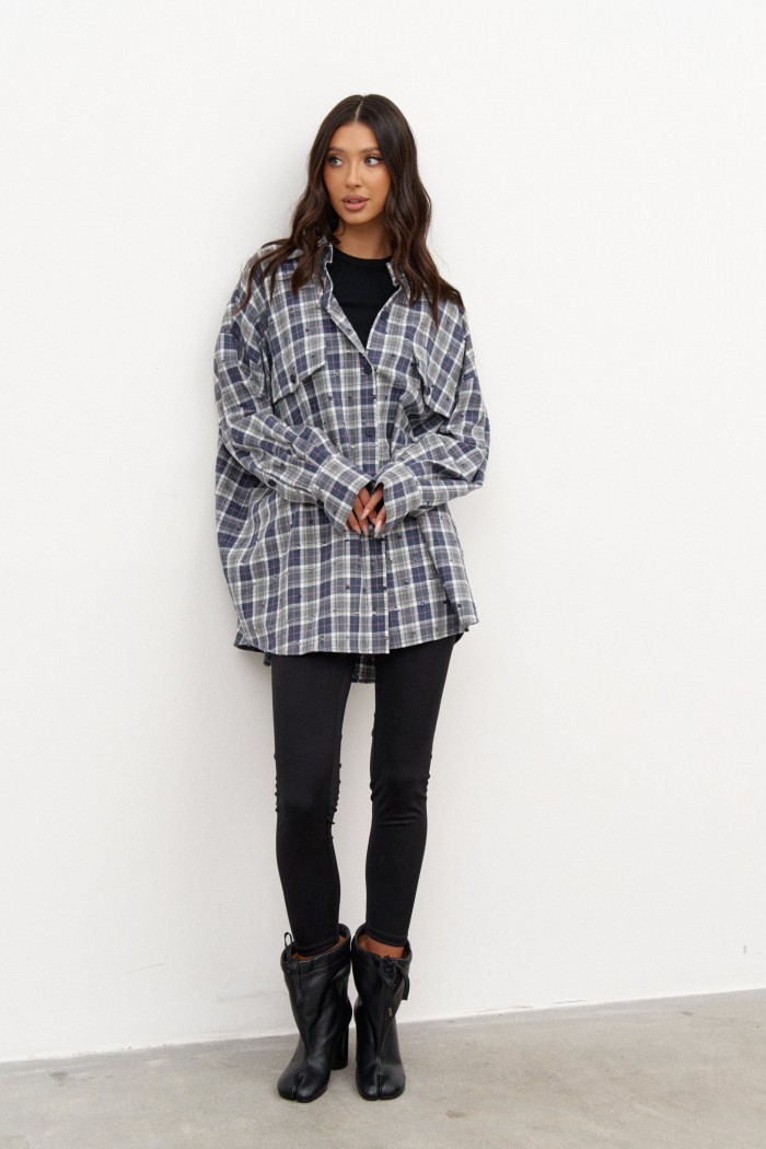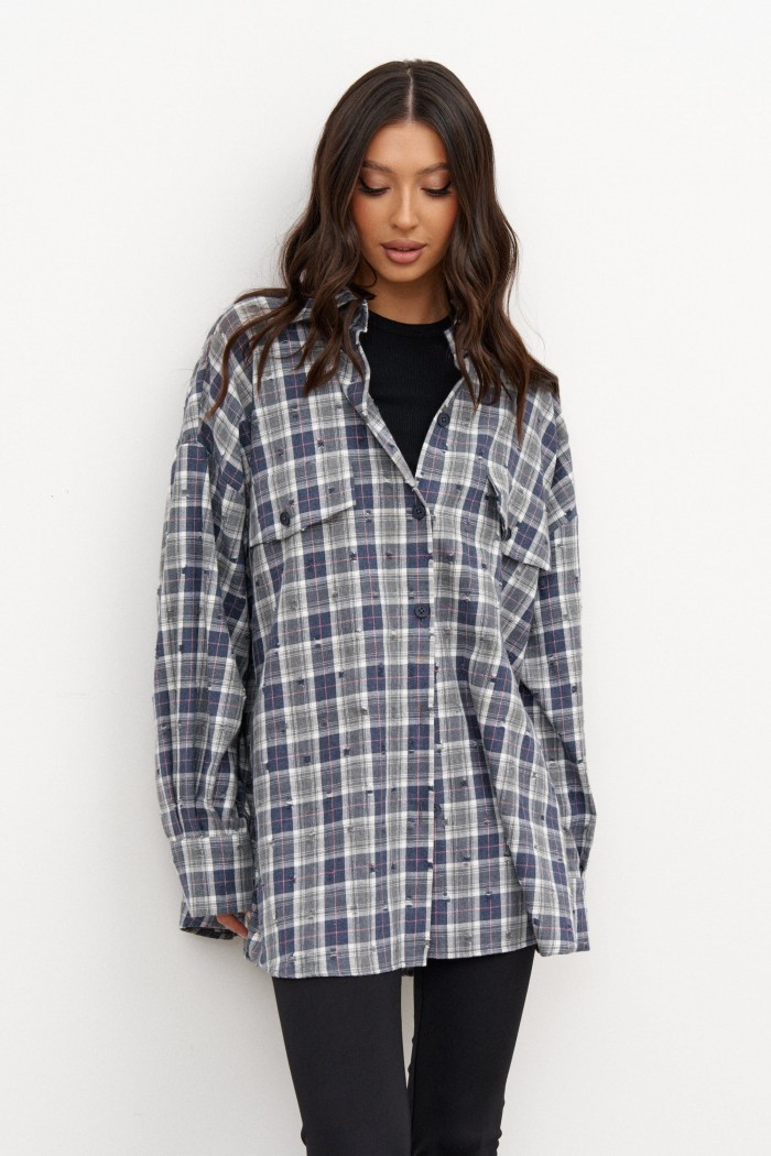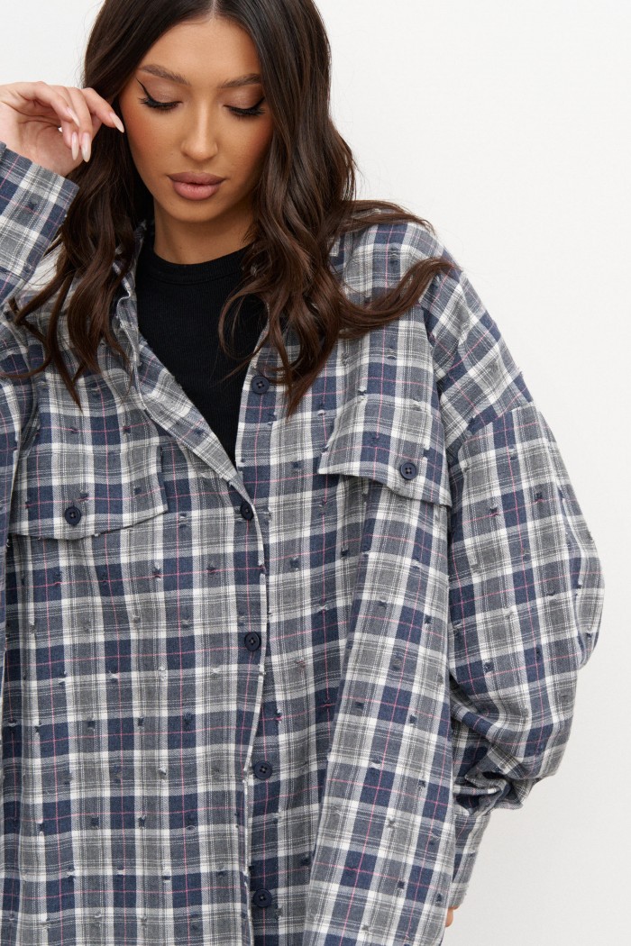 Рубашка прямого свободного кроя. Выполнена из фланели с эффектом потёртости. Воротник отложной. Застёжка центральная на пуговицы. По переду на уровни линии груди клапаны - имитация карманов. Рукав спущенный, свободный, с манжетой на пуговице. Длина рукава от линии втачивания 53 см. Спинка отрезная со сборкой. Длина спинки 76 см