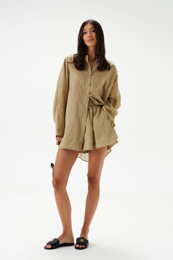 Рубашка свободного кроя выполнена из натурального полотна рами. Характеристики: рубашка прямого свободного кроя, горловина стойка. Застежка центральная на петли пуговицы, рукав акцентный объёмный, крой рукава «летучая мышь» , спинка отрезная с декоративной сборкой. Длина по спинке 80 см, длина рукава от горловины 76 см.