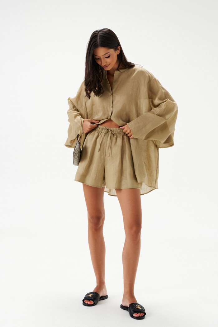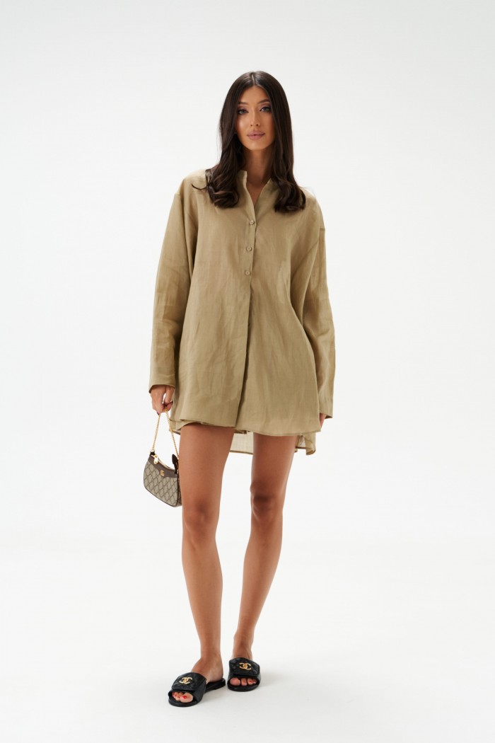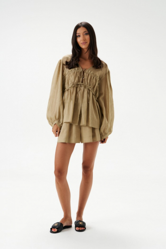 Рубашка свободного кроя выполнена из натурального полотна рами. Характеристики: рубашка прямого свободного кроя, горловина стойка. Застежка центральная на петли пуговицы, рукав акцентный объёмный, крой рукава «летучая мышь» , спинка отрезная с декоративной сборкой. Длина по спинке 80 см, длина рукава от горловины 76 см.