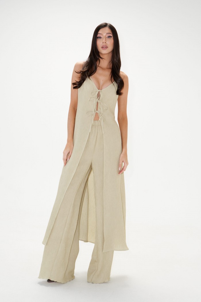 Длинная блузка полуприлегающего силуэта, на бретелях. По груди нагрудные вытачки. Лиф блузона на подкладке. Бретели узкие на регуляторах. Застежка центральная на шнурки-завязки. Длина по спинке 113см.