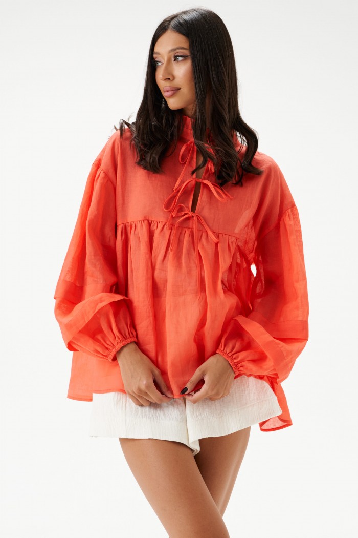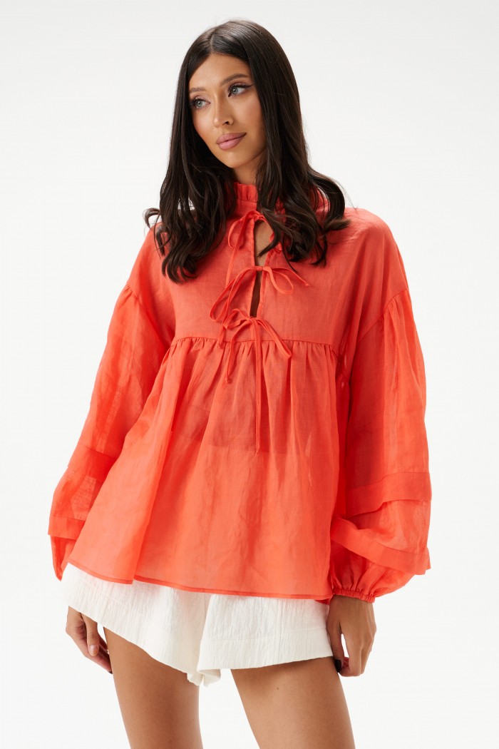 Блуза свободного кроя. Выполнена из легкого натурального полотна- рами . По переду и по задней части фигурная кокетка. По переду на кокетке тесьма-завязки (завязки функциональные). Рукав втачной, немного спущен. Низ рукава на резинкей.  Длина по спинке 63 см, длина рукава 52 см.