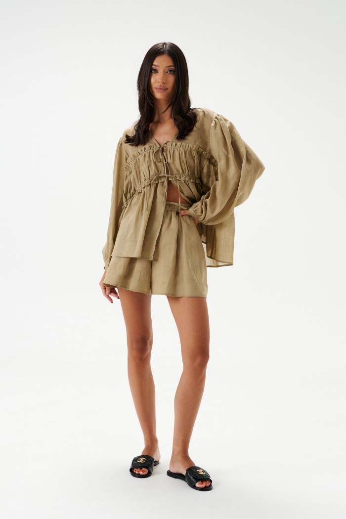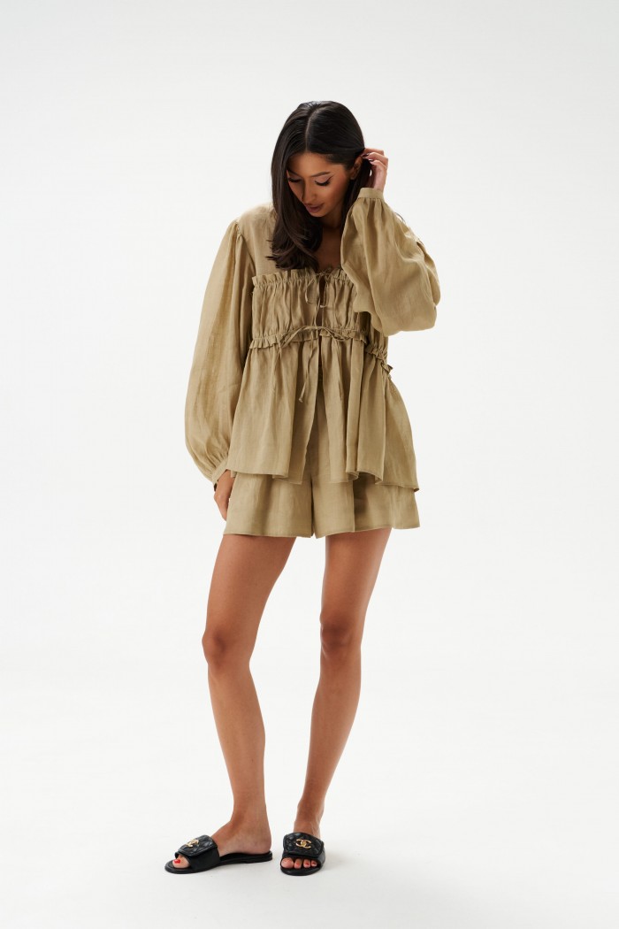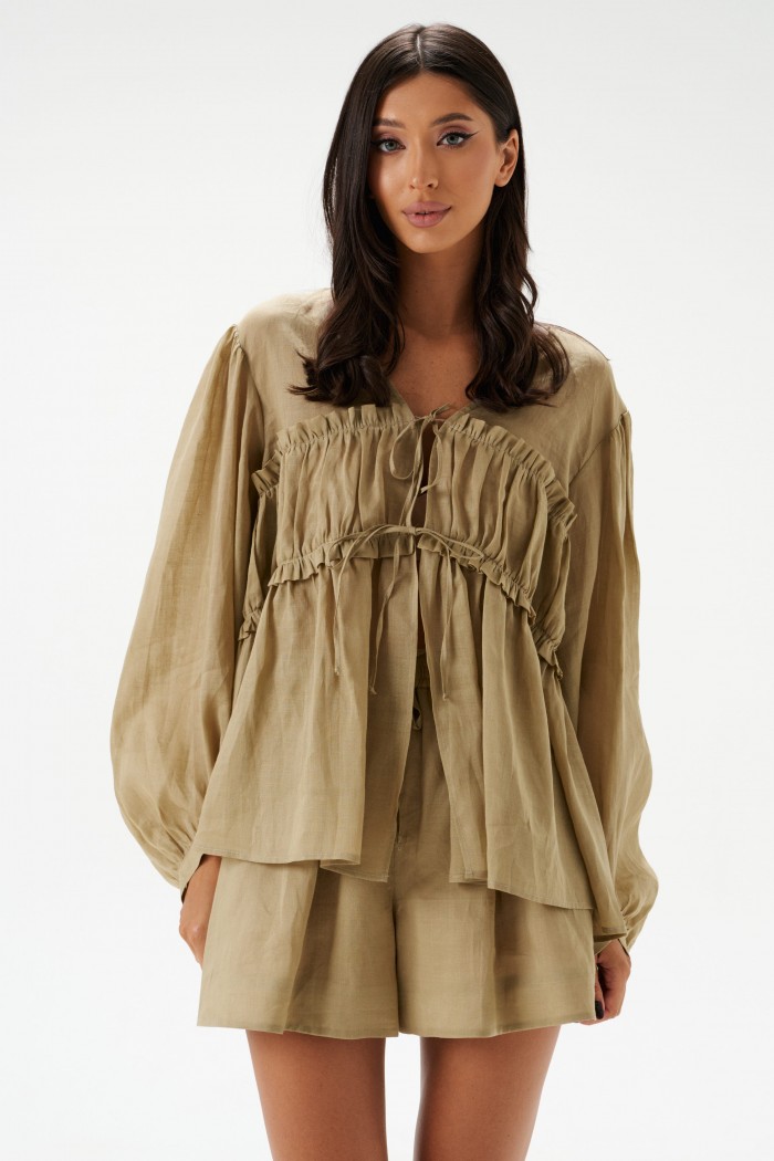 Блузка свободного кроя, выполнена из легкого натурального полотна нежно-розового цвета. Прямой свободный крой, рукав широкий вточной, низ присборен на  фигурную узкую манжету, V-образный вырез, лиф отрезной  по линии талии, застежка центральная на шнурки-завязки. Длина по спинке 64 см, длина рукава от края горловины 68 см.