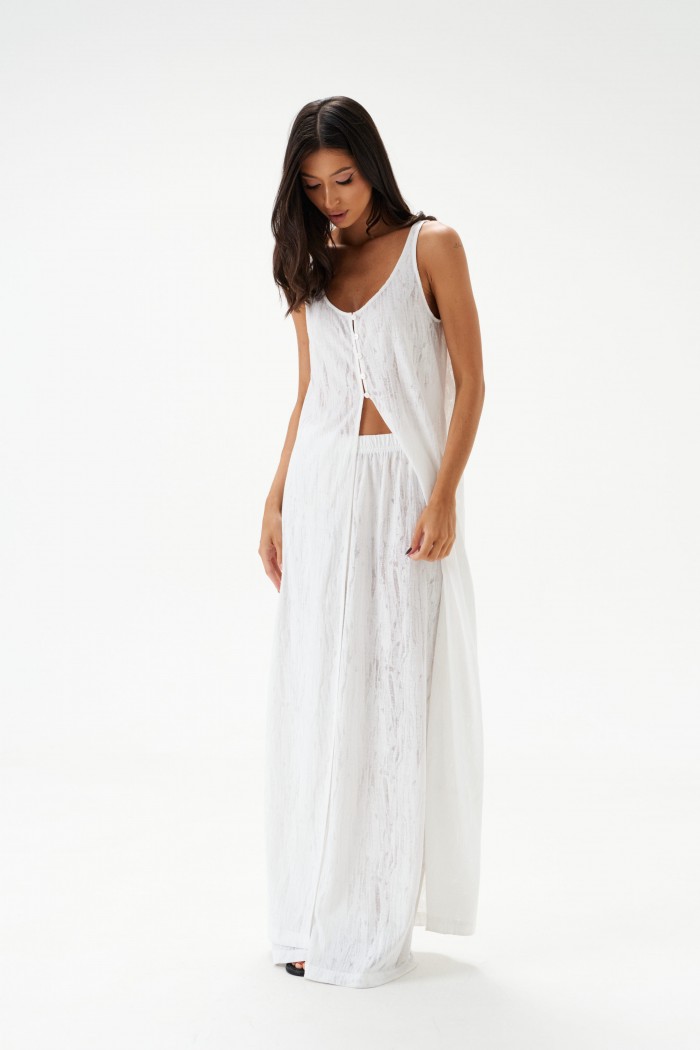 Блузон длины макси выполнен из трикотажного полотна полупрозрачного светлого цвета. Силуэт свободный. Без подкладки. Застёгивается от груди на ряд пуговиц. Длина по спинке 139см.