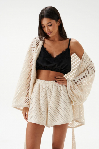 Кардиган свободного кроя. Выполнен из фактурного хлопкового полотна светло-бежевого цвета. Рукав втачной, спущенный. На уровне линии талии шлёвки. В комплекте пояс из ткани основного изделия. Длина рукава от линии втачивания 55 см. Длина спинки 74 см