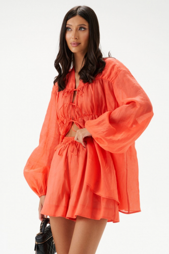 Кардиган свободного кроя. Выполнен из фактурного хлопкового полотна светло-бежевого цвета. Рукав втачной, спущенный. На уровне линии талии шлёвки. В комплекте пояс из ткани основного изделия. Длина рукава от линии втачивания 55 см. Длина спинки 74 см