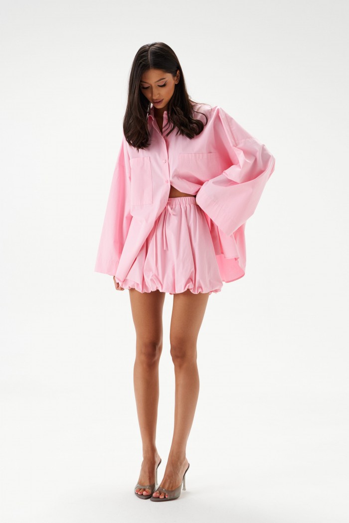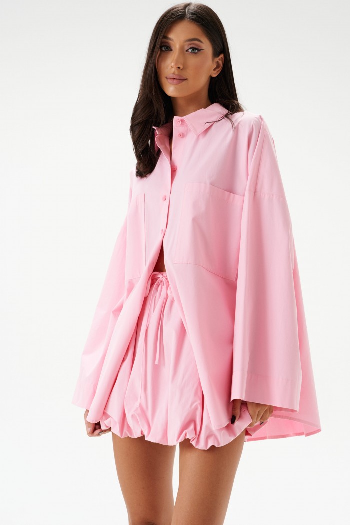 Рубашка прямого свободного кроя. Выполнена из хлопкового (смесового) полотна нежно-розового цвета. Воротник отложной. Рукав втачной, спущенный, широкий. Спинка отрезная с кокеткой со сборкой. В боковых швах разрезы (13,5 см). На уровне груди накладные карманы. Застёжка центральная – пуговички. Длина рукава от линии втачивания 45,5 см. Длина спинки 74 см. Рубашку дополняют шорты А1541