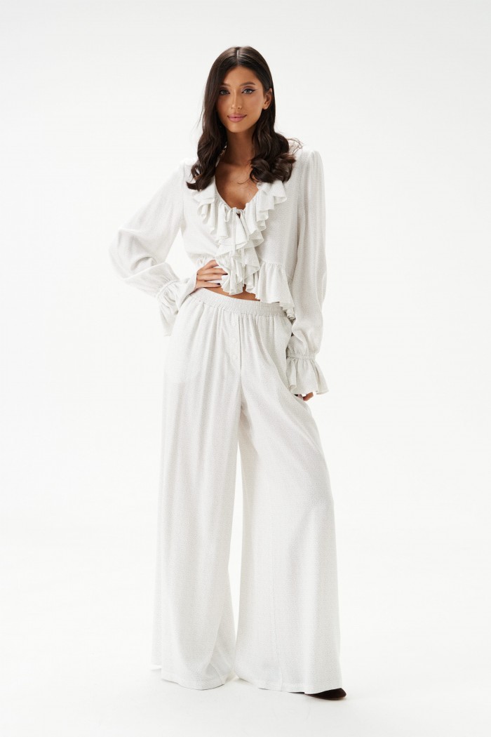 Блузка из текстильного полотна белого цвета в мелкий горошек, свободного облегания, укороченная.