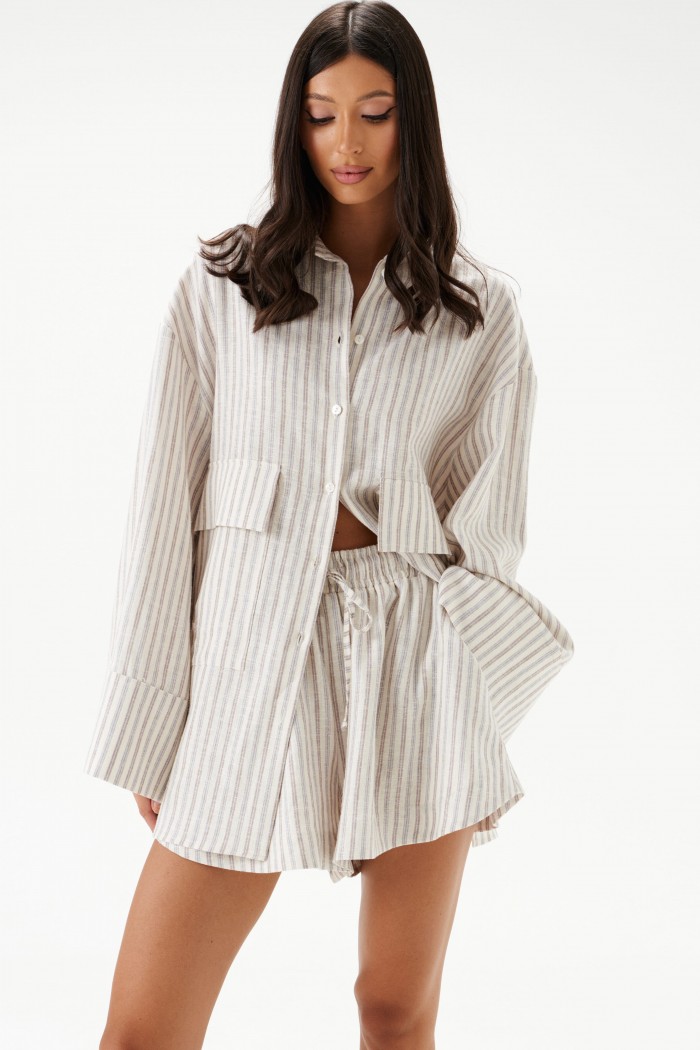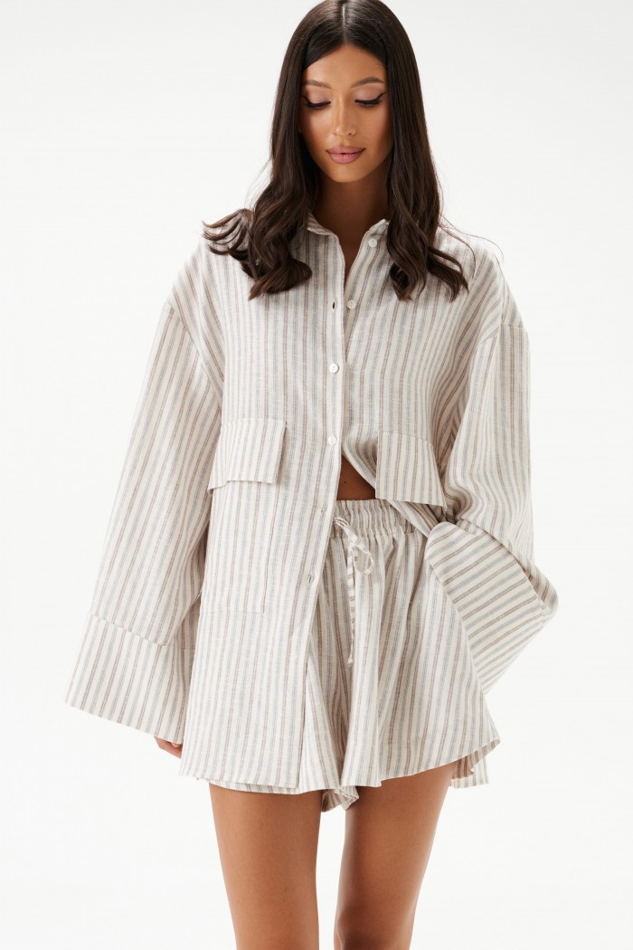 Блузка прямого свободного кроя выполнена из льняного полотнав полоску.