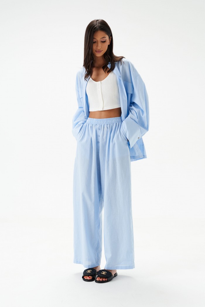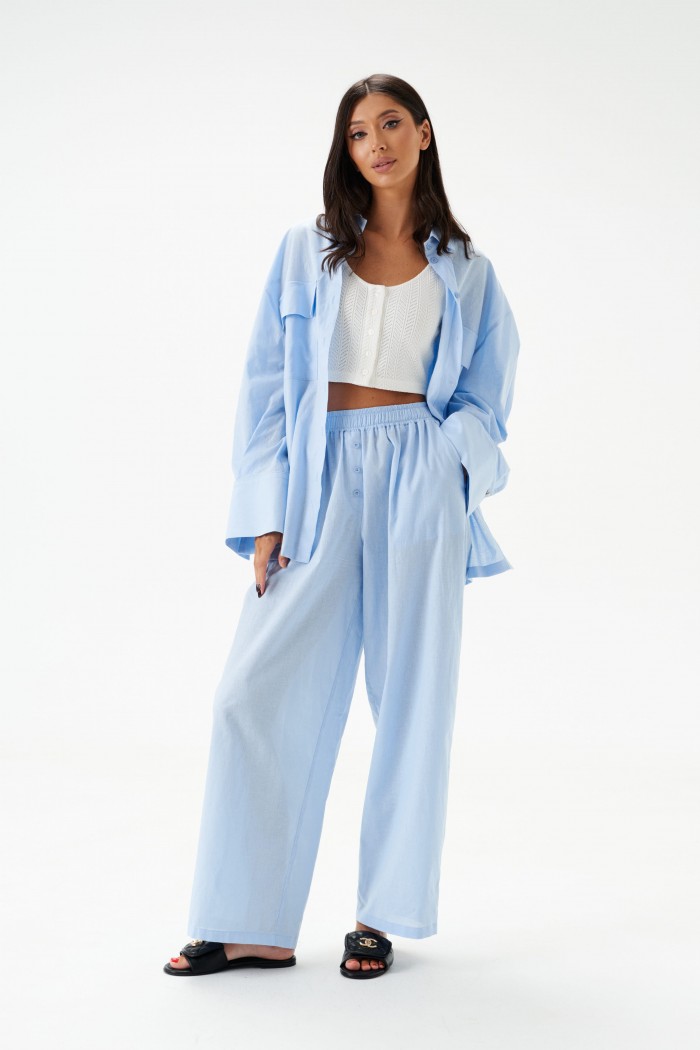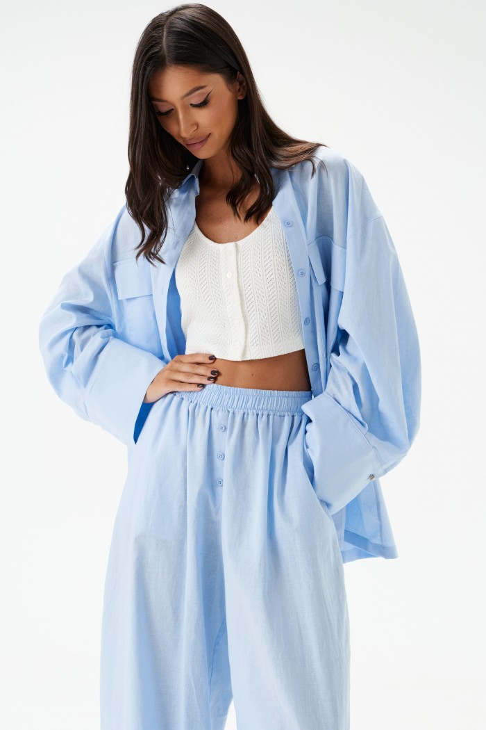 Рубашка прямого свободного кроя выполнена из хлопкового полотна голубого цвета. Характеристики: отложной воротник, застежка центральная на петли пуговицы, рукав расклешен - спущен, по низу рукава широкая манжета на пуговице, по переду нашиты карманы с клапоном, спинка отрезная с декоративной сборкой. Длина спинки 72 см, длина рукава от края горовины 76 см.