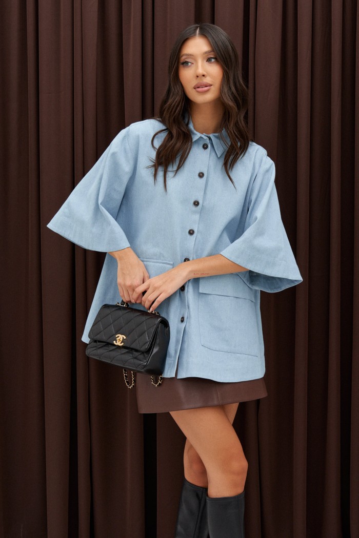 Рубашка прямого свободного кроя. Выполнен из тонкого джинсового полотна голубого цвета. Характеристики: прямой свободный крой, короткий широкий рукав, застежка центральная на пуговицы. По переду функциональные накладные карманы с клапанами. Длина спинки 68см, длина рукава 34см.