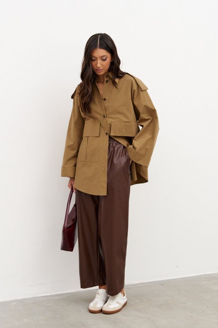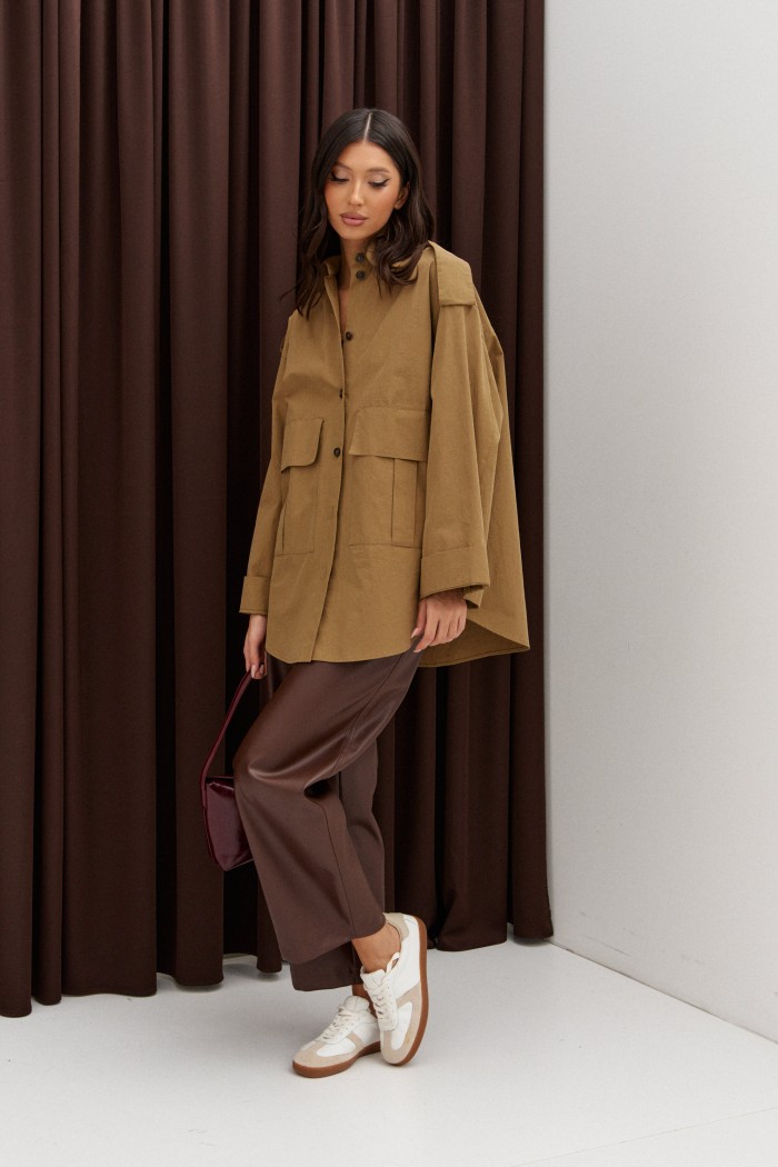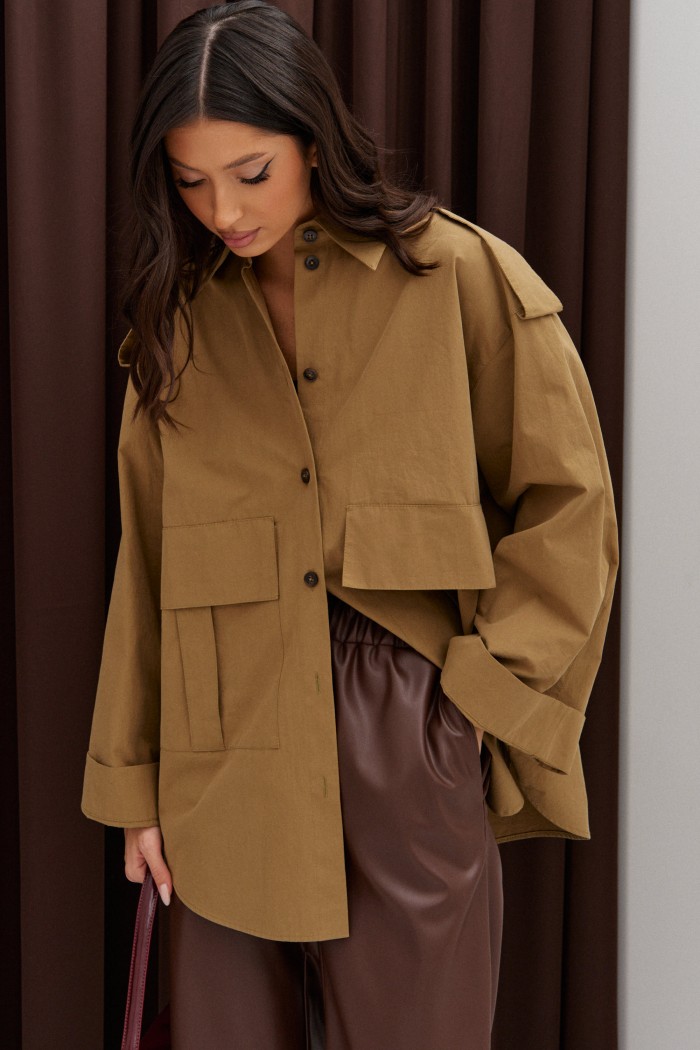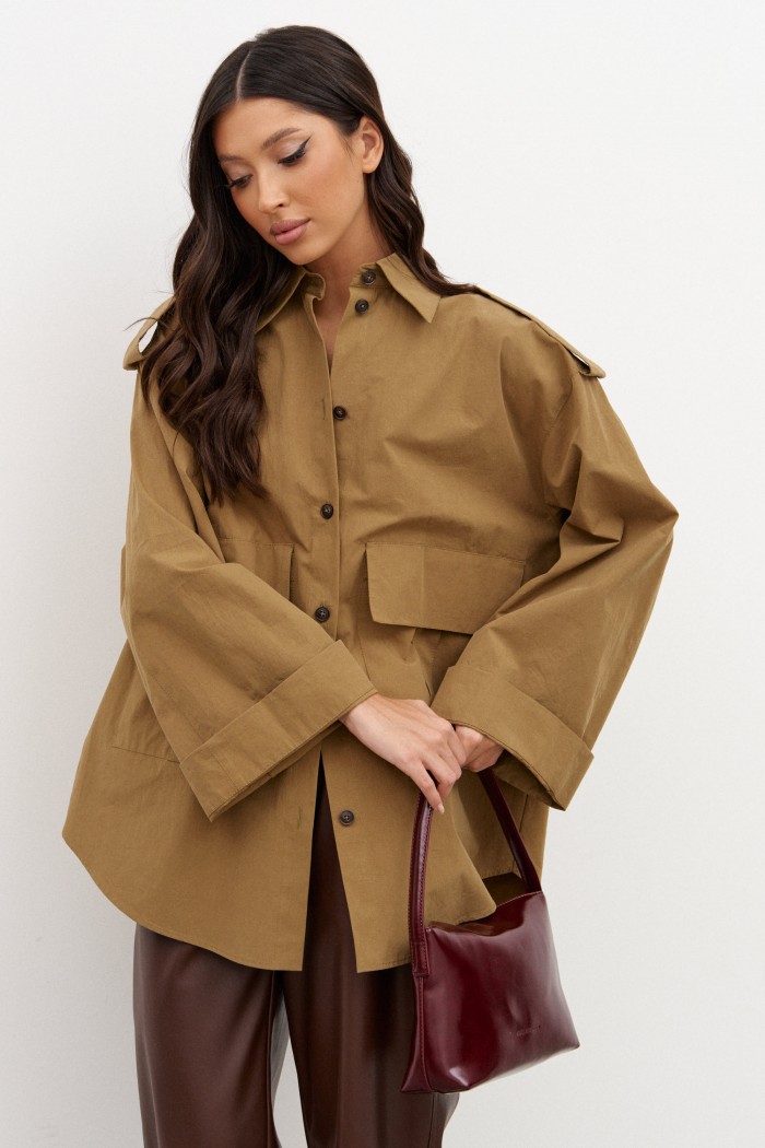 Рубашка прямого свободного кроя. Выполнен из полотна цвета хаки. Характеристики: прямой свободный крой, широкий рукав, на плечиках паты на пуговице, застежка центральная на пуговицы, скругленный край. По переду функциональные накладные карманы с клапанами. Длина спинки 76см, длина рукава 75см.