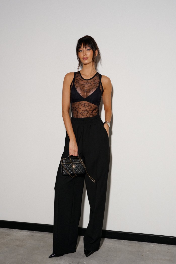 Боди прилегающего силуэта, выполнено из кружевного полотна черного цвета.