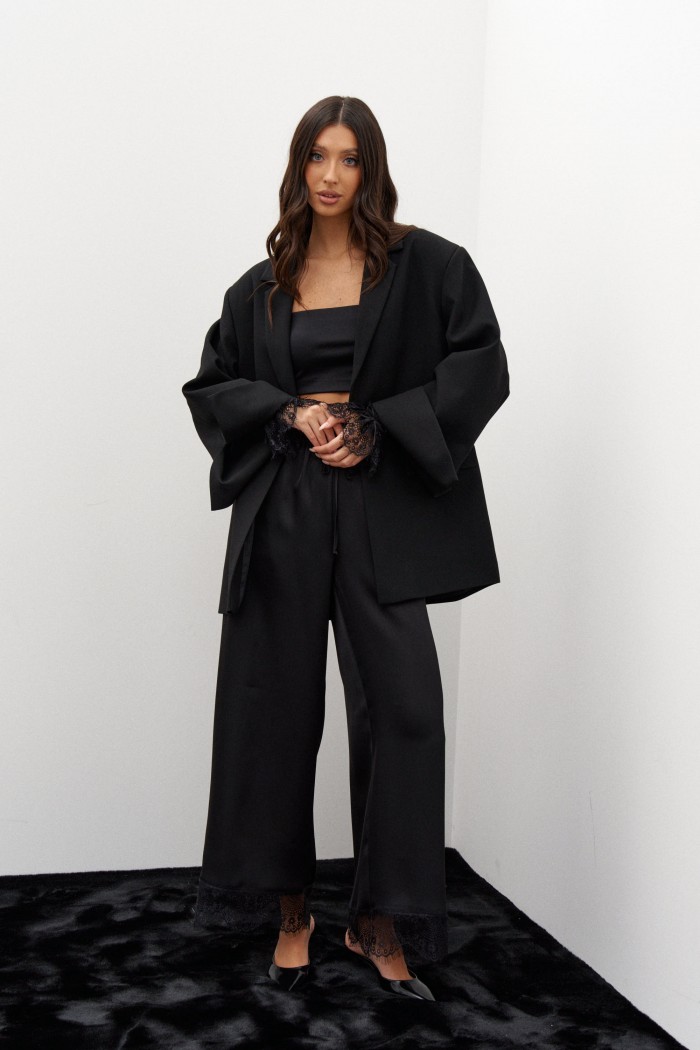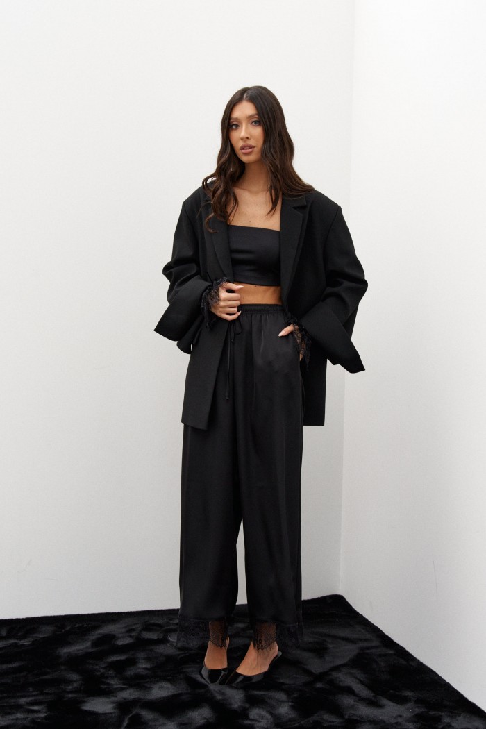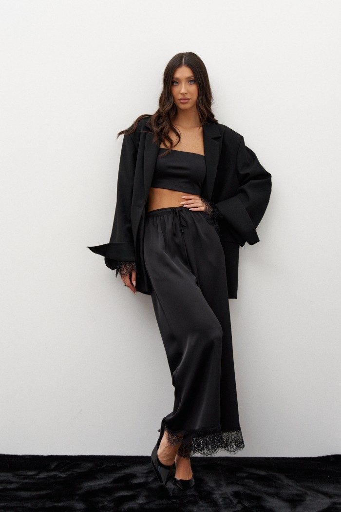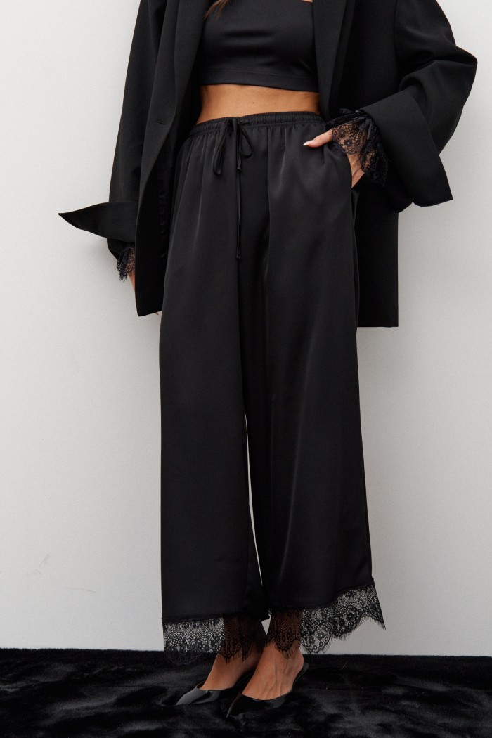 Брюки выполнены из атласной струящейся ткани черного цвета. Характеристики: прямой свободный крой, пояс на кулиске , в боковых швах карманы, декоративное кружево по низу изделия. Длина брюк 102 см.
