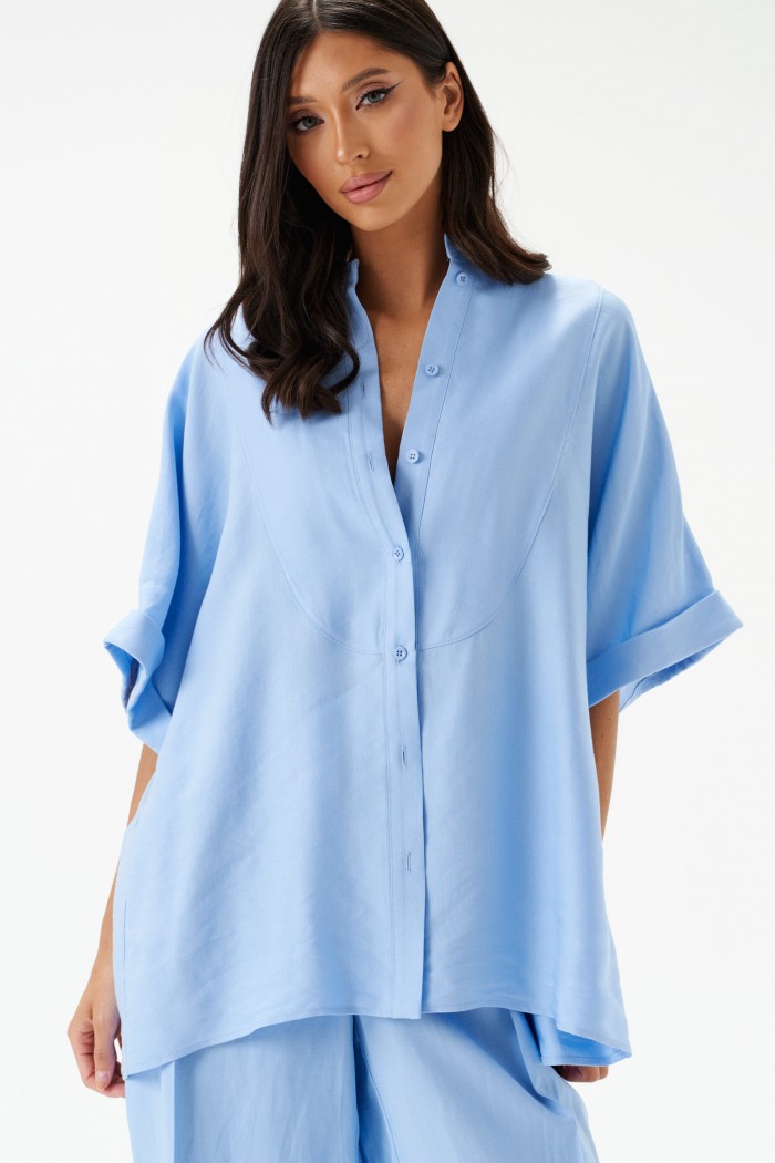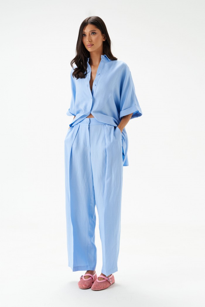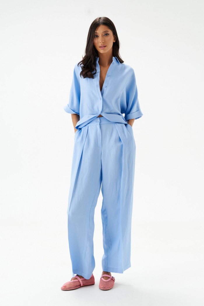 Брюки женские, длинные, прямые, выполнены из текстильного полотна голубого цвета.