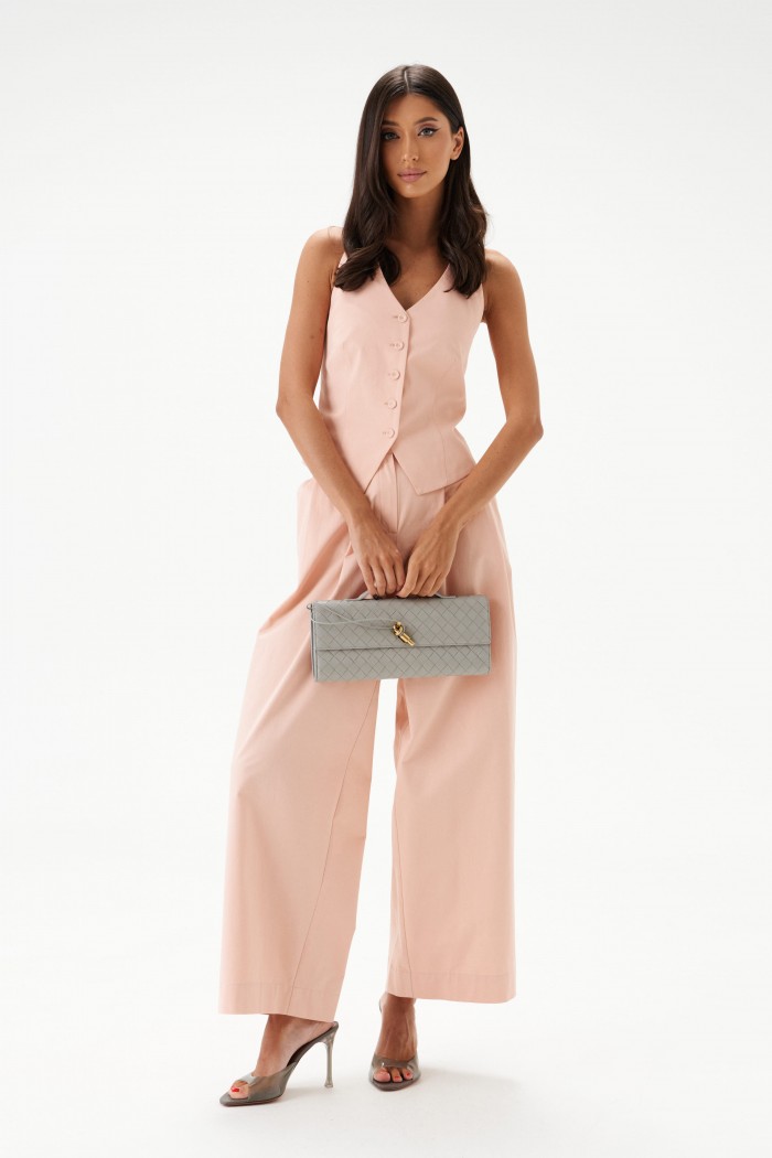 Брюки свободного кроя. Выполнены из хлопкового полотна нежно-розового цвета. Пояс по переду стабильный, пояс по спинке на резинке. По переду от пояса складки. В боковых швах карманы с отрезным бочком. По заднему полотну накладные клапаны (имитация карманов). Застёжка центральная – молния, пуговица. Длина по боковому шву 102 см. Брюки дополнит жилет А5483/1