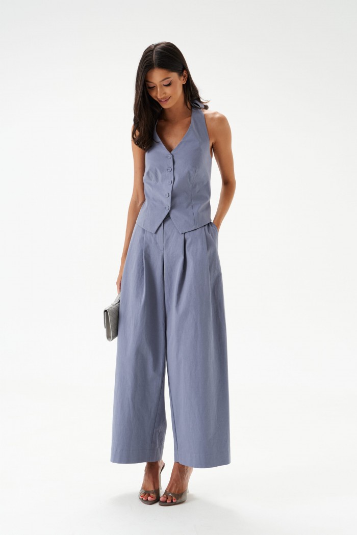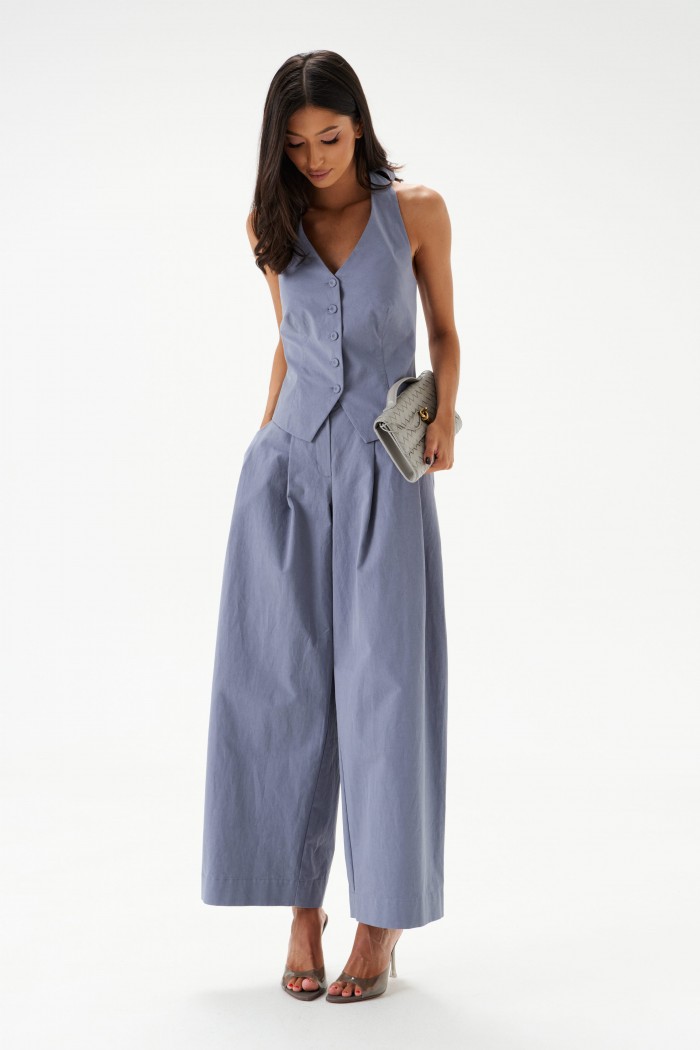 Брюки свободного кроя. Выполнены из хлопкового полотна серо-голубого цвета. Пояс по переду стабильный, пояс по спинке на резинке. По переду от пояса складки. В боковых швах карманы с отрезным бочком. По заднему полотну накладные клапаны (имитация карманов). Застёжка центральная – молния, пуговица. Длина по боковому шву 102 см. Брюки дополнит жилет А5483