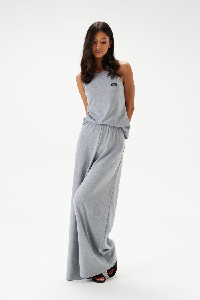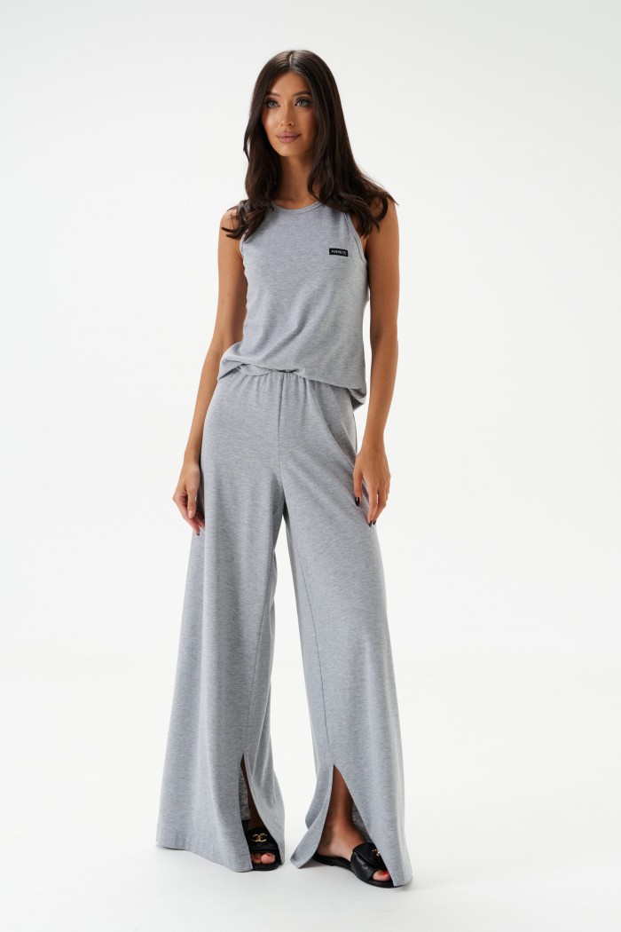 Брюки прямого кроя выполнены из трикотажного полотна серого цвета.