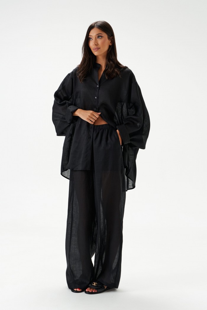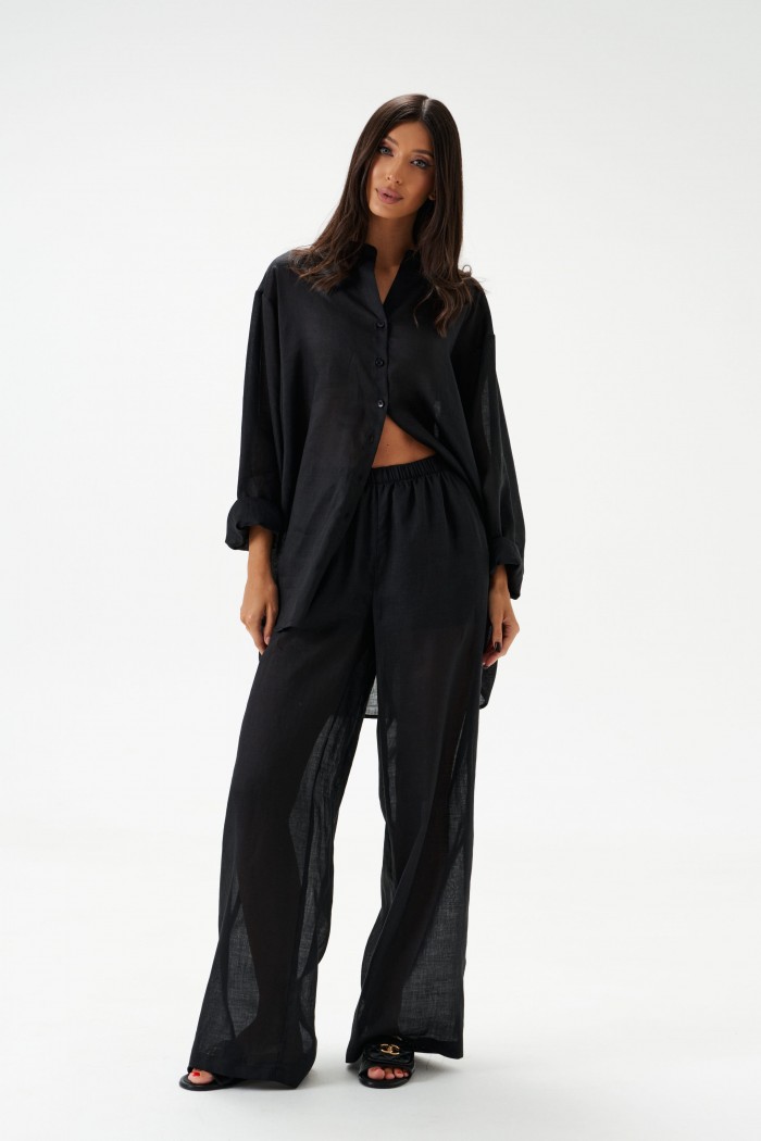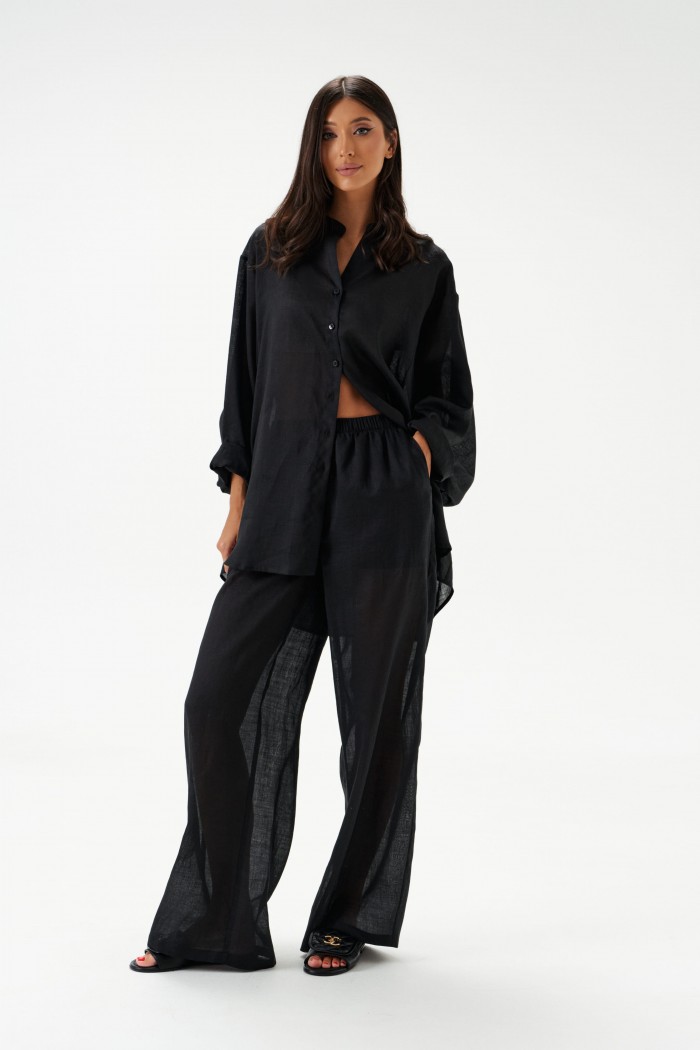 Брюки прямого, свободного кроя. Выполнены из натурального полотна рами, черного цвета. Характеристики: свободный крой, пояс на резинке, в боковых швах карманы. Подкладка - шорты 28см. Длина изделия по боковому шву 107см.