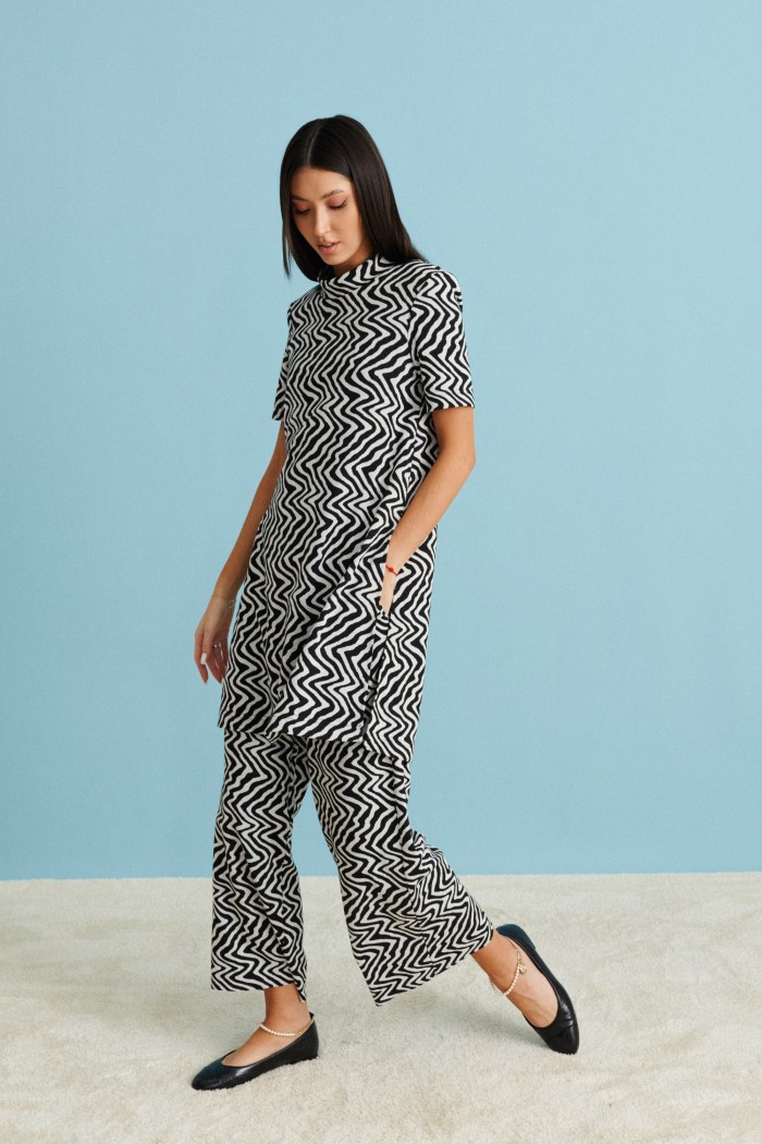 Кюлоты прямого свободного кроя с комфортной эластичной резинкой выполнены из трикотажного полотна с абстрактным принтом.