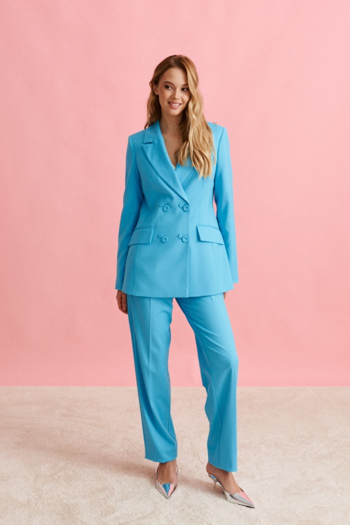 Брюки прямого кроя выполнены из легкой костюмной ткани.
