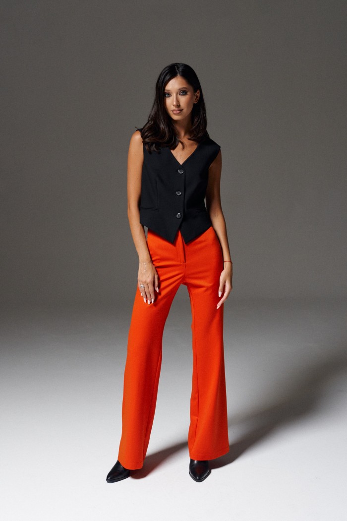Характеристики: полуприлегающий силуэт, пояс стабильный, по поясу нашиты шлевки, по переднему и заднему полотну брюк стрелки, по заднему полотну прорезные кармашки «обманки». Длина изделия 117 см.