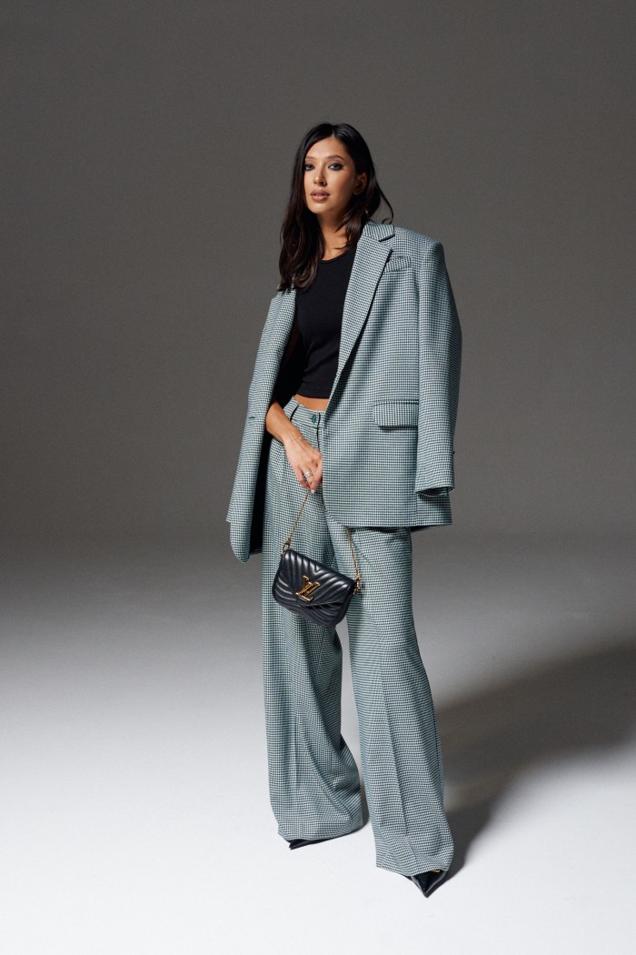 Брюки прямого кроя выполнены из ткани с зеленным оттенком с геометрическим мелким принтом.