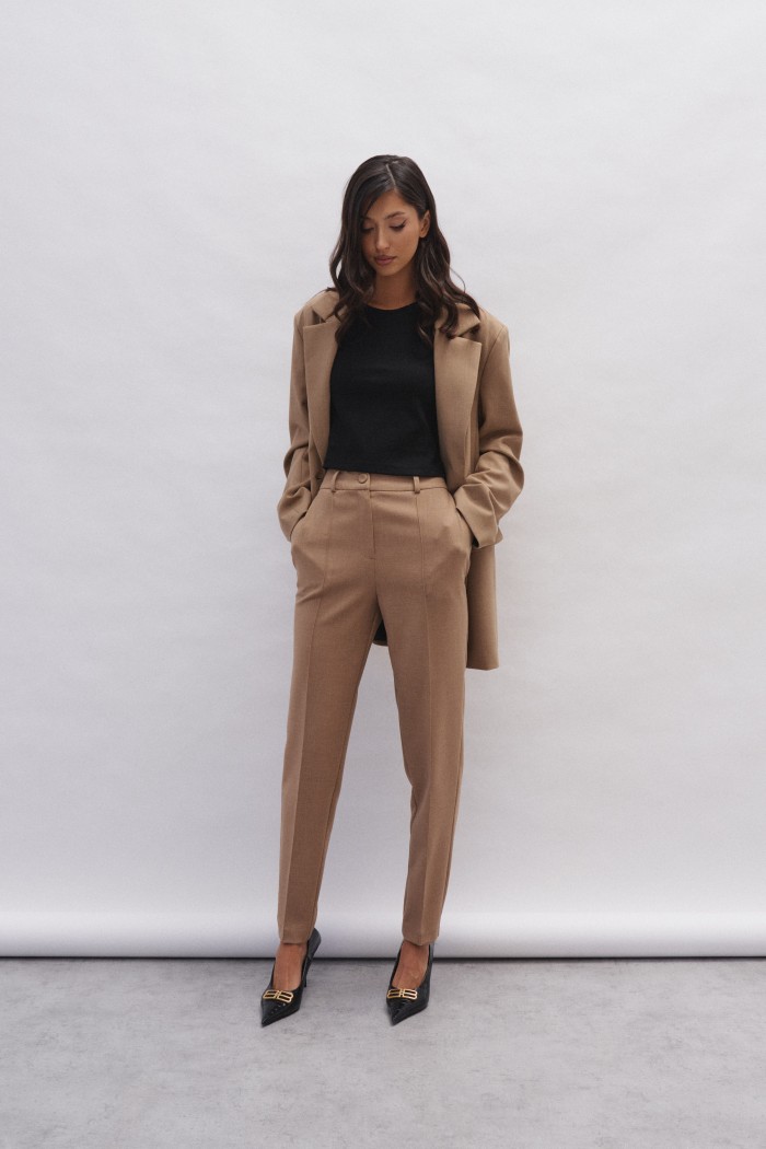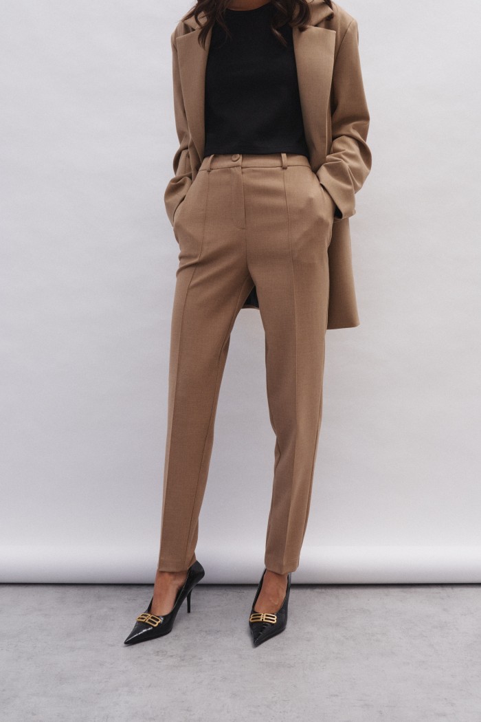Брюки зауженные к низу выполнены из полотна цвета песок.
