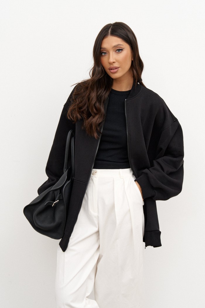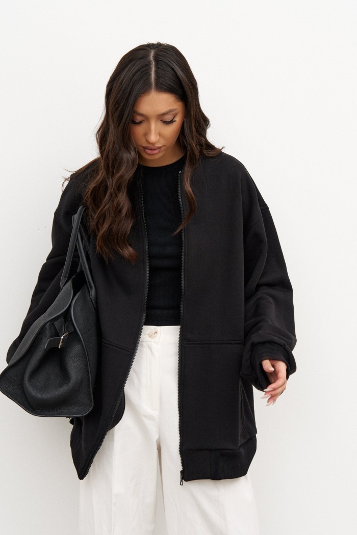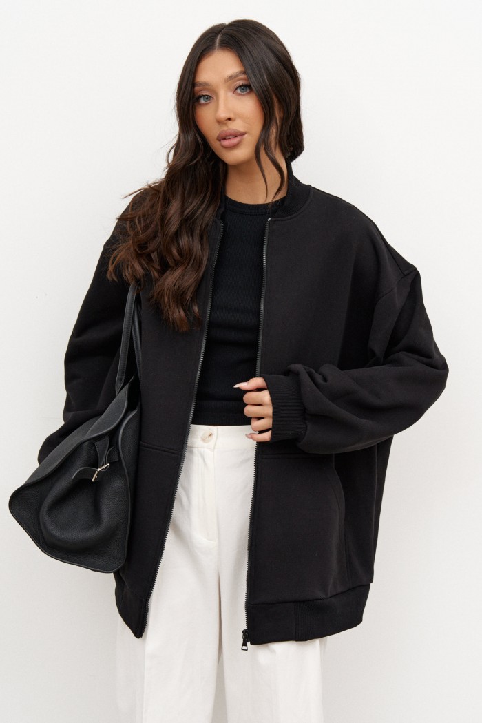Джемпер выполнен из трикотажного полотна черного цвета. Характеристики: прямой крой, воротник-стойка, застежка центральная - молния, рукав спущен, по низу рукава манжета, по низу изделия крупный карман. Длина джемпера 74 см, длина рукава 57 см.