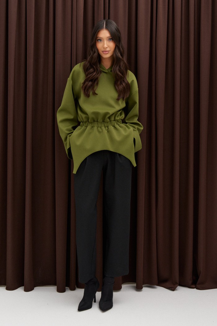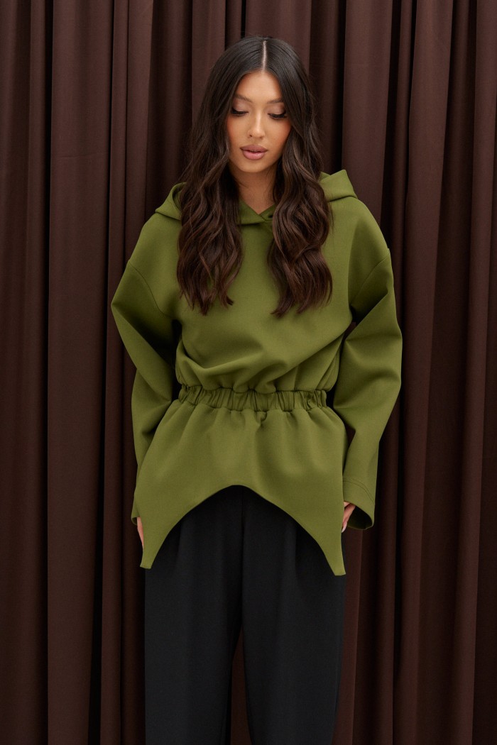 Джемпер свободного кроя. Выполнен из трикотажного полотна - неопрен. Круглая горловина, капюшон. Рукав спущенный, втачной. По линии талии отрез на резинке, от отреза фигурная баска. Длина рукава от линии втачивания 56 см. Длина центра спинки 61 см