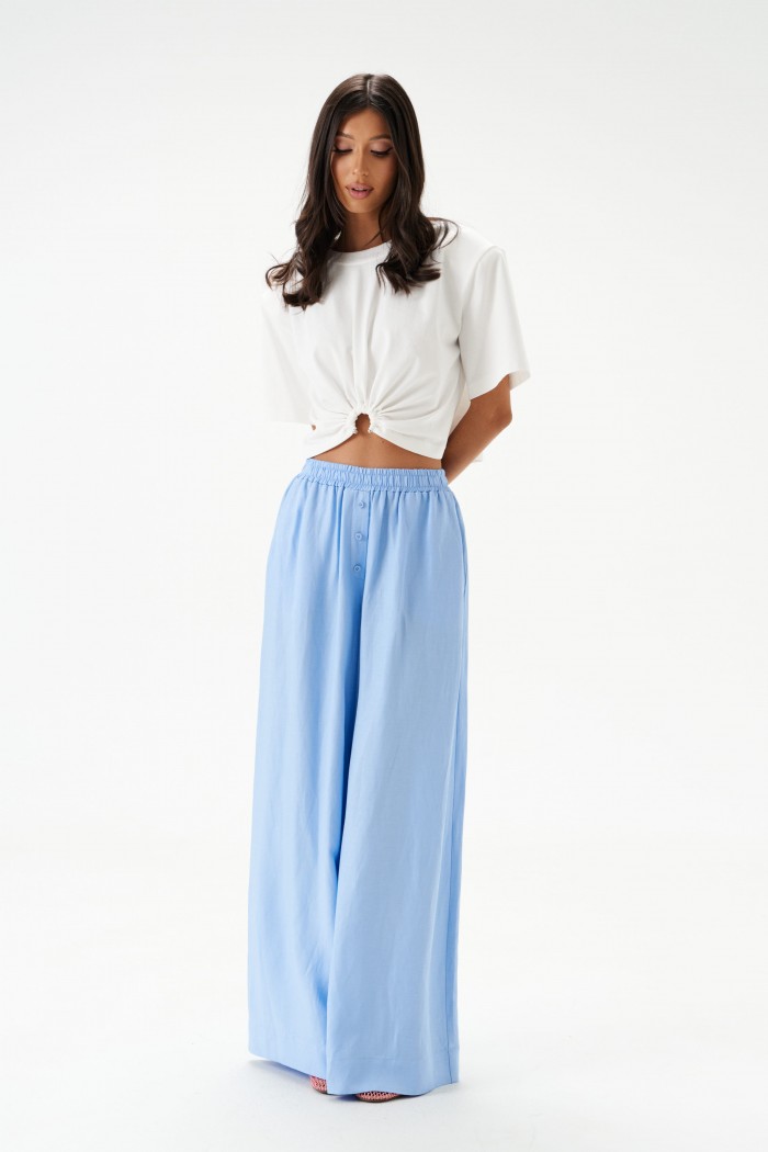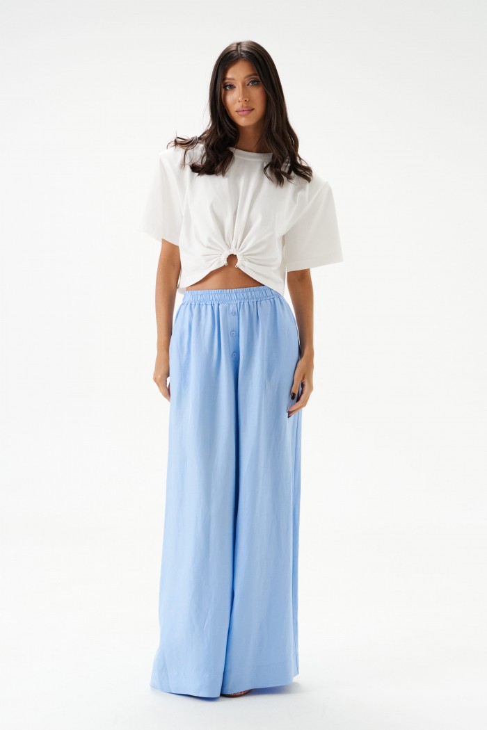 Футболка прямого кроя, выполнена из хлопкового полотна белого цвета. Характеристика: укороченая, прямой свободный крой, горловина овальная, рукав слегка спущен, подплечники, спереди декоративная сборка на элемент-полукольцо . Длина по центру спинки от края горловины 40 см, длина рукава от края горловины 39 см.