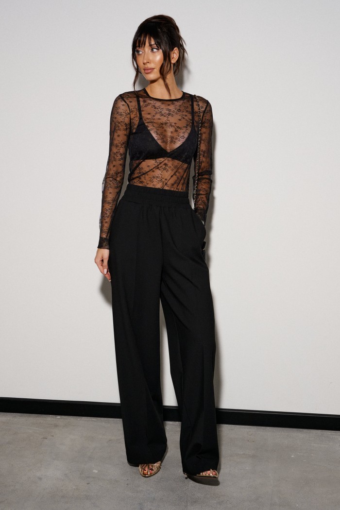 Джемпер (лонгслив) полуприлегающего силуэта. Выполнен из сетчатой ткани чёрного цвета с узором. Вырез горловины круглый. Рукав втачной. Низ изделия и рукава с не обработанным краем. Длина рукава от линии втачивания 67 см. Длина спинки 57 см
