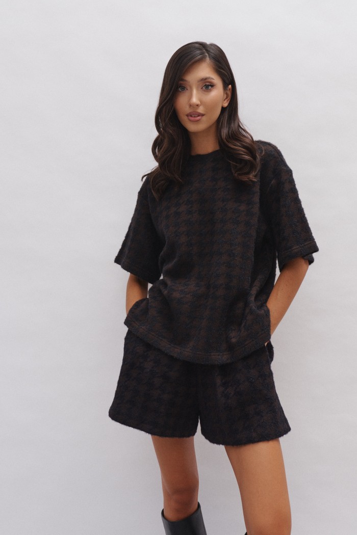 Джемпер прямого свободного кроя выполнен из фактурного плотного полотна с геометрическим абстрактным принтом. Образ дополнит юбка артикул А317, шорты артикул А322.