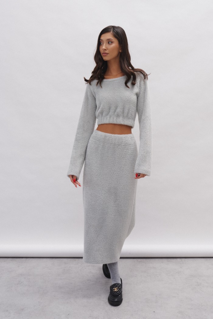 Укороченный джемпер прямого кроя выполнен из мягкого фактурного полотна серого цвета.