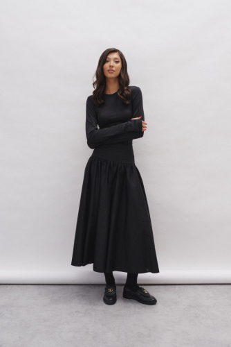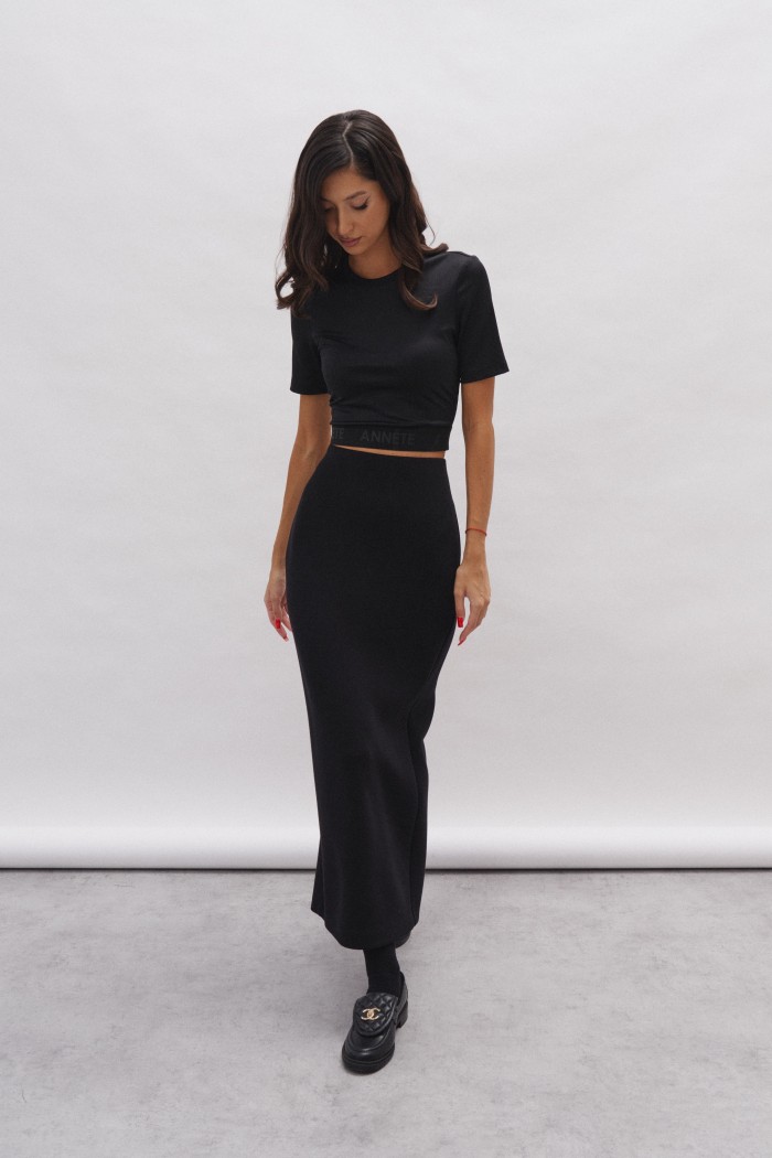 Укороченный топ прилегающего силуэта выполнен из ткани черного цвета.
