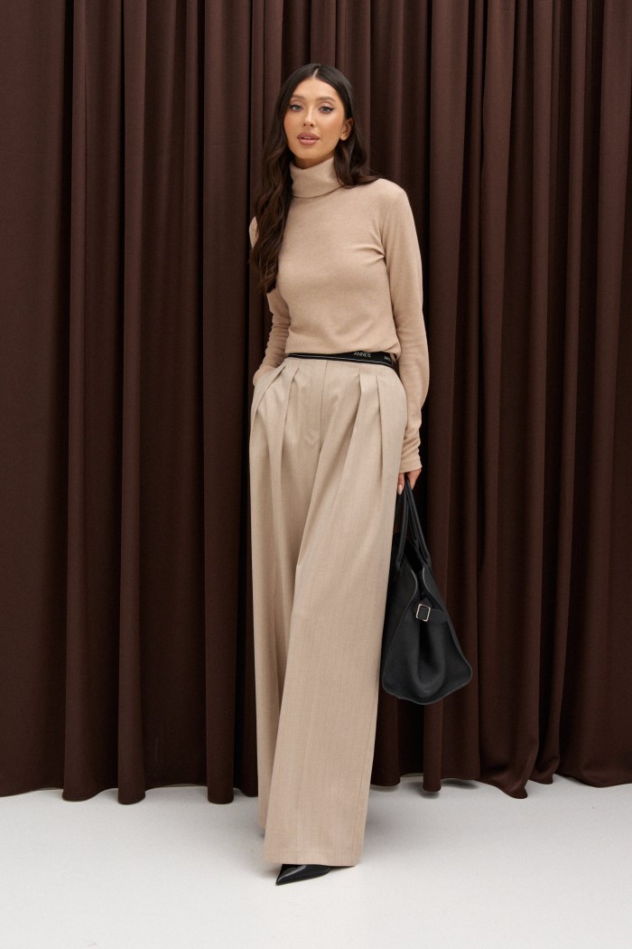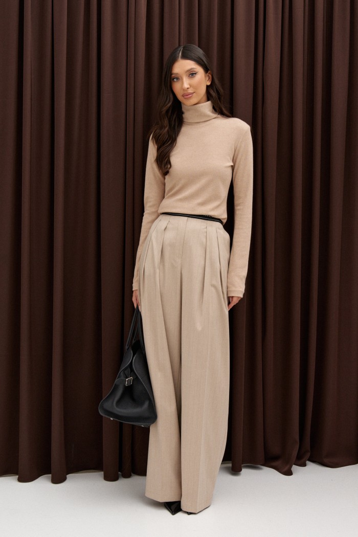 Джемпер полуприлегающего силуэта, выполнен из трикотажного полотна бежевого цвета цвета. Характеристики: полуприлегающий силуэт, горловина стойка, рукав втачной. Длина от края горловины 60 см, длина рукава от края горловины 34 см.
