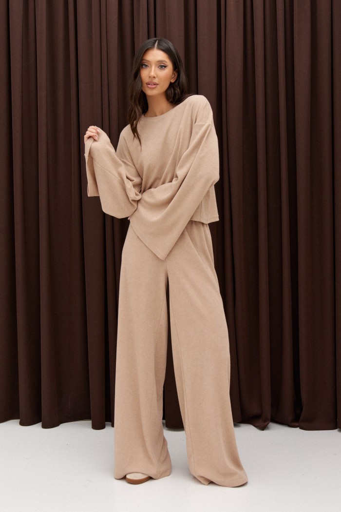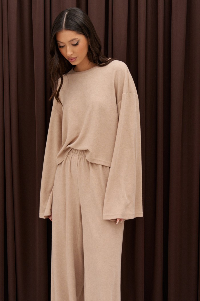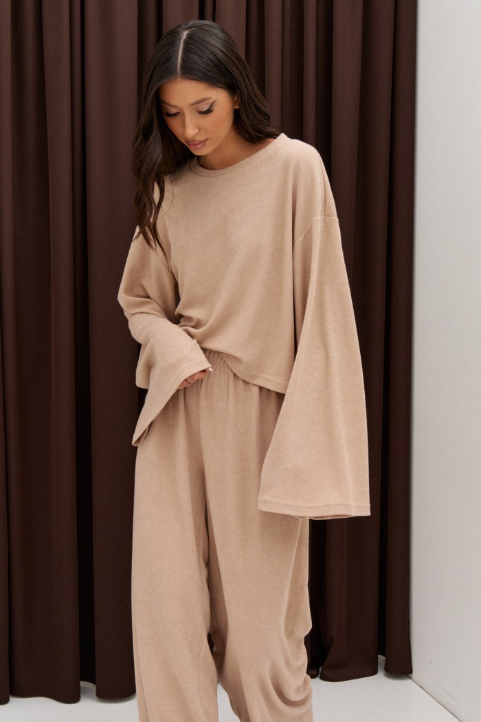 Джемпер свободного прямого кроя выполнен из трикотажного полотна бежевого цвета. Характеристики: прямой крой, спушенный широкий рукав, горловина овальная. Длина по спинке 50 см, длина рукава от края горловины 53 см.