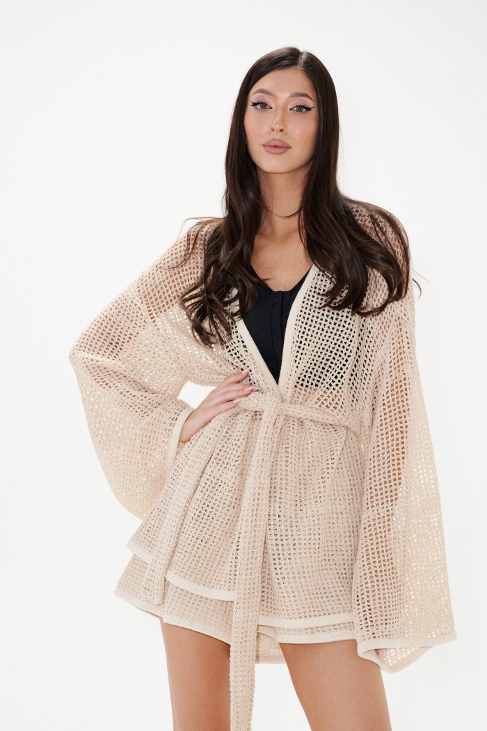 Кардиган прямого свободного кроя. Выполнен из хлопкового полотна. Линия плеча спущенная. Рукав втачной, широкий. В комплекте пояс-завязка из ткани основного изделия. Длина рукава 50 см. Длина спинки 75 см