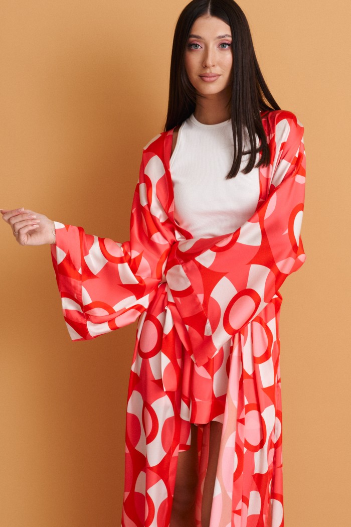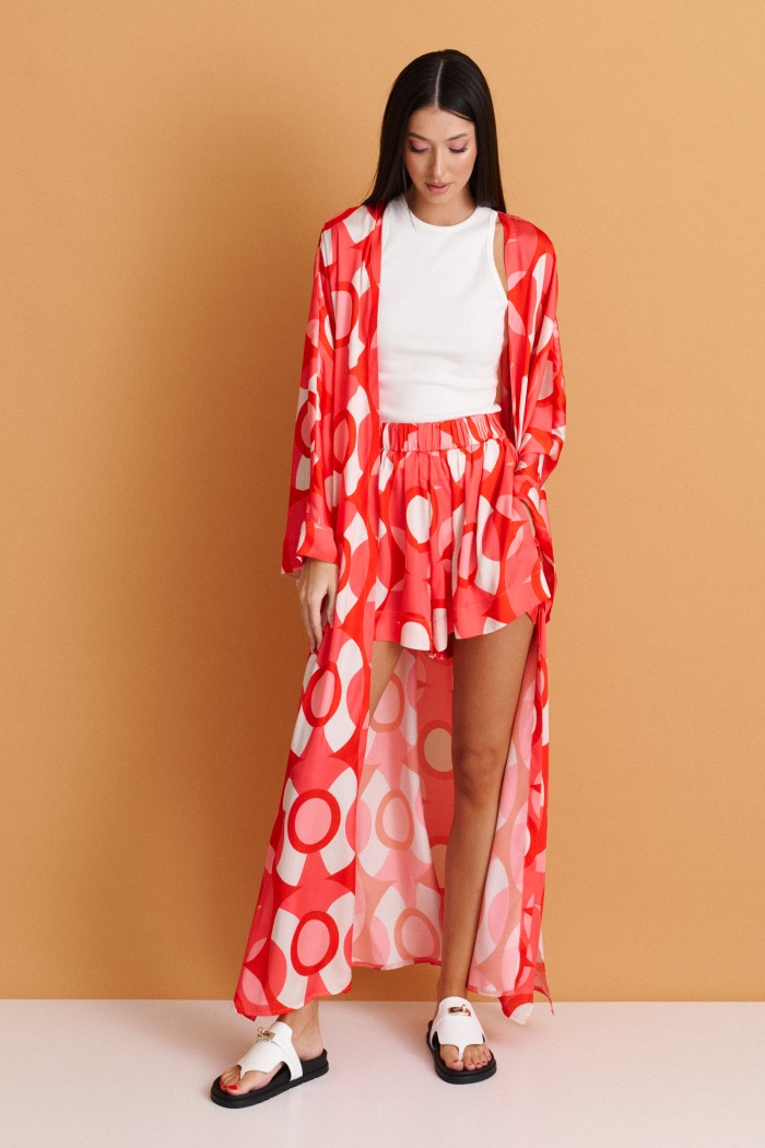 Кардиган прямого свободного кроя выполнен из струящейся ткани с контрастным ярким принтом.