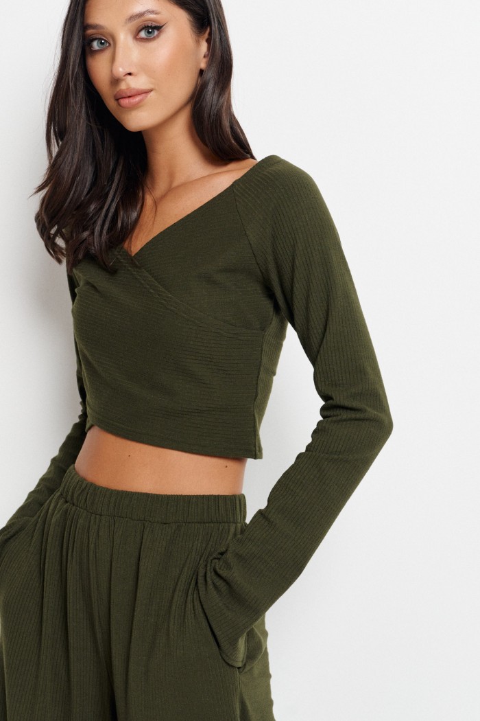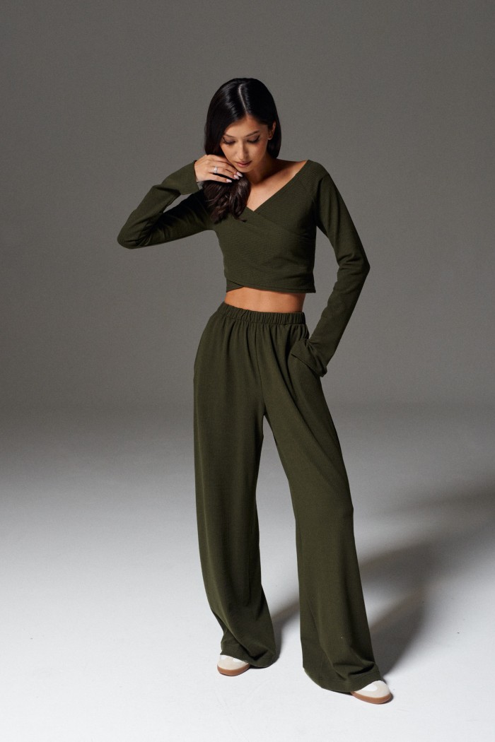 Характеристики: укороченный топ, по передней части изделия перекрестный вырез, рукав втачной. Длина по спинке 34 см, длина рукава 68 см от края горловины. Брюки прямой крой, пояс на резинке. Длина брюк 110 см.