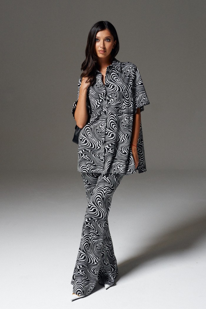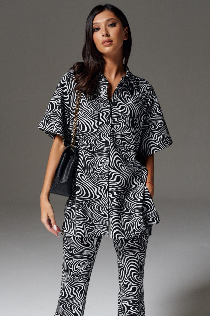 Комплект состоит из рубашки и брюк выполнен из трикотажного полотна с анималистическим принтом.
