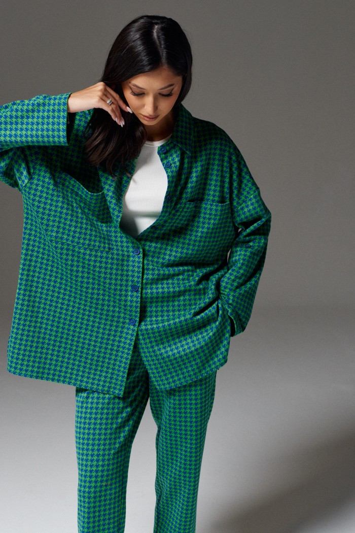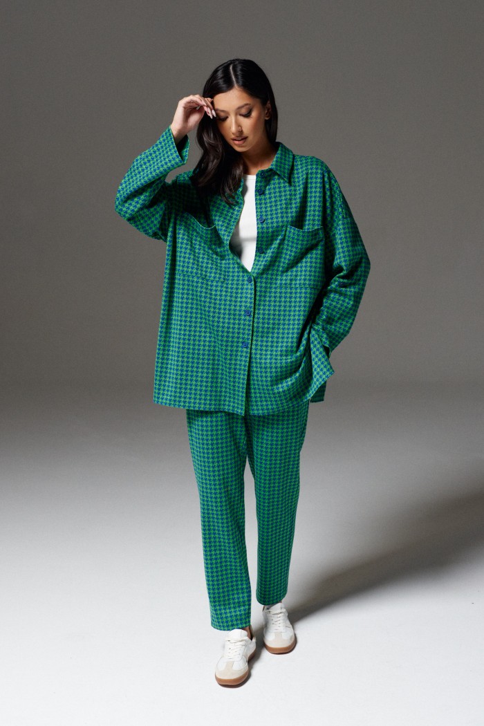 Комплект состоит из рубашки и брюк выполнен из трикотажного полотна с абстрактным геометрическим принтом.