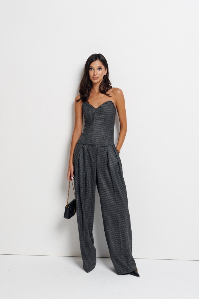 Корсет с фигурным вырезом выполнен из костюмной ткани с принтом.