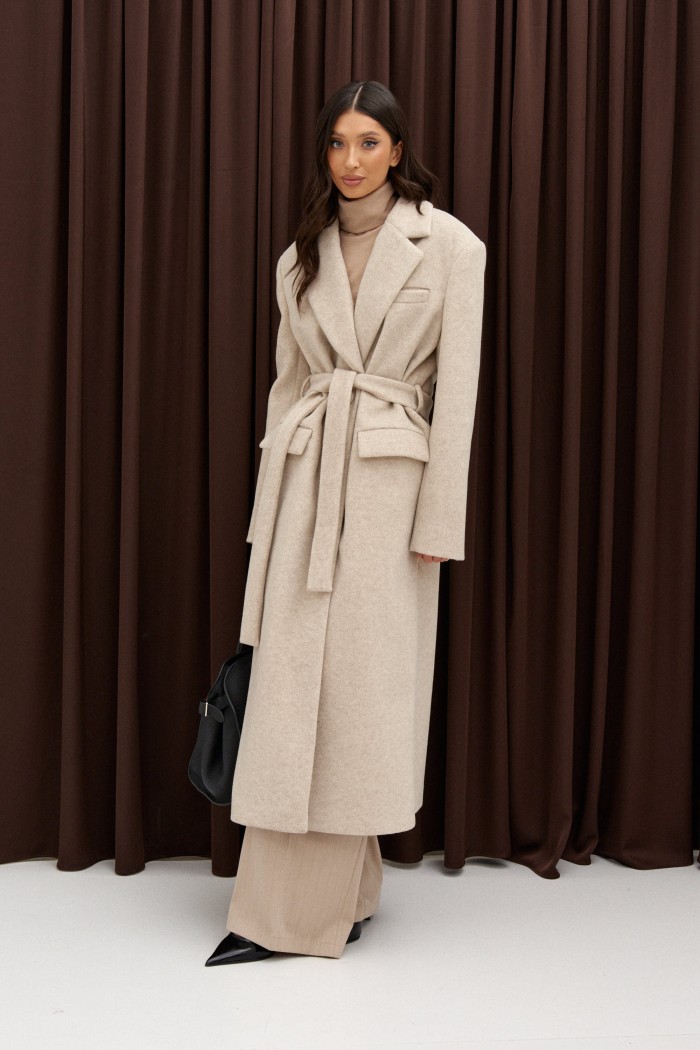 Стильное пальто прямого кроя выполнено из фактурного полотна светло-бежевого цвета. Характеристики: прямой крой, покладка, подплечники, отложной воротник с остроугольным лацканом, застежка центральная на петли пуговицы, по линии талии шлевки, в комплекте пояс из ткани основного изделия, рукав втачной, по низу рукава нашиты пуговички, по переду прорезные карманы с клапаном, в среднем шве заднего полотна изделия разрез 58 см. Длина по спинке 129 см, длина рукава 63 см.