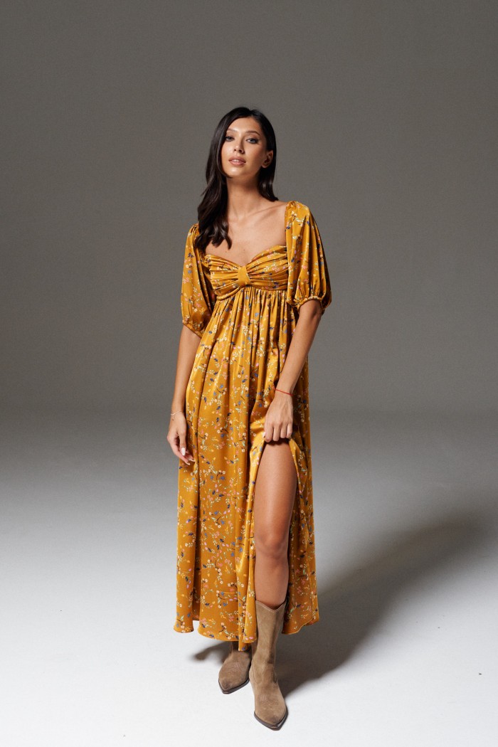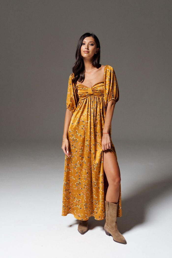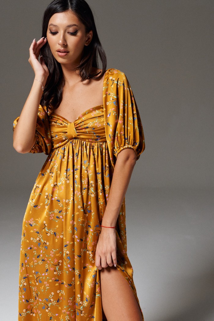 Платье полуприлегающего силуэта выполнено из полотна цвета медь с принтом полевые цветы.