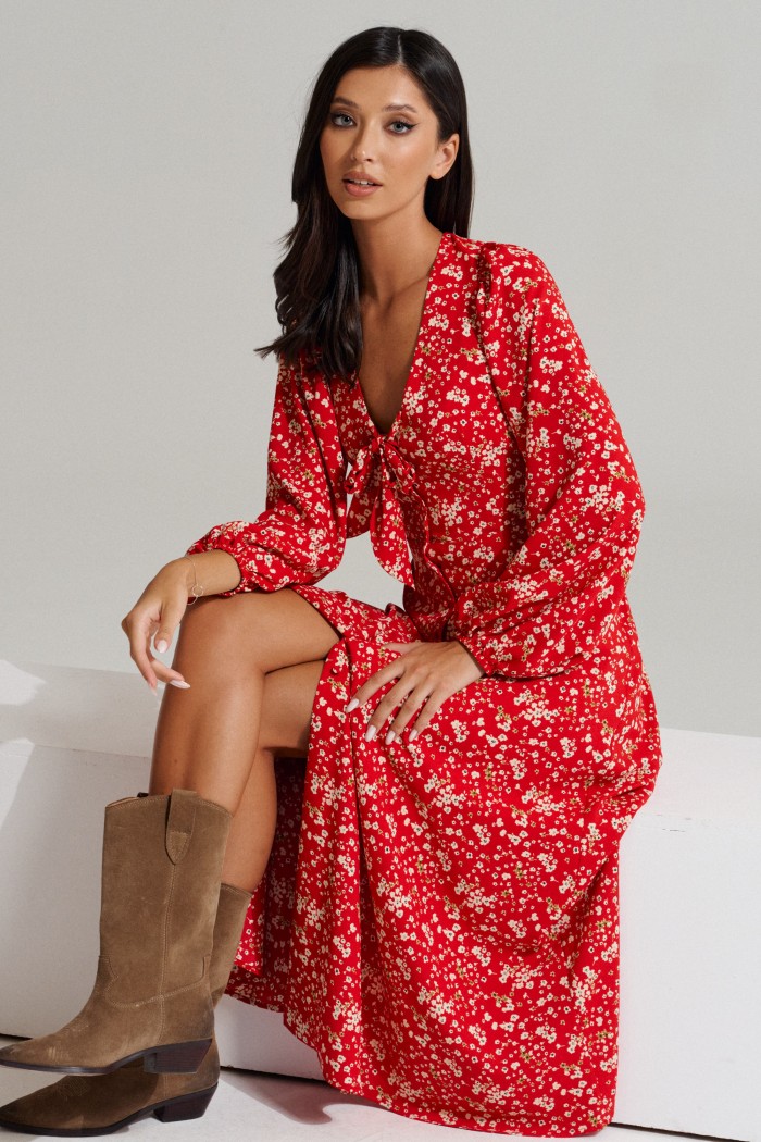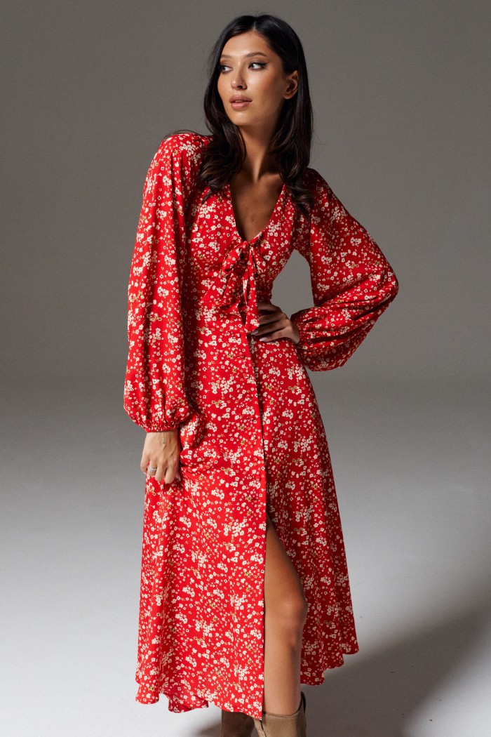 Платье полуприлегающего силуэта выполнено из красного полотна с цветочным принтом.