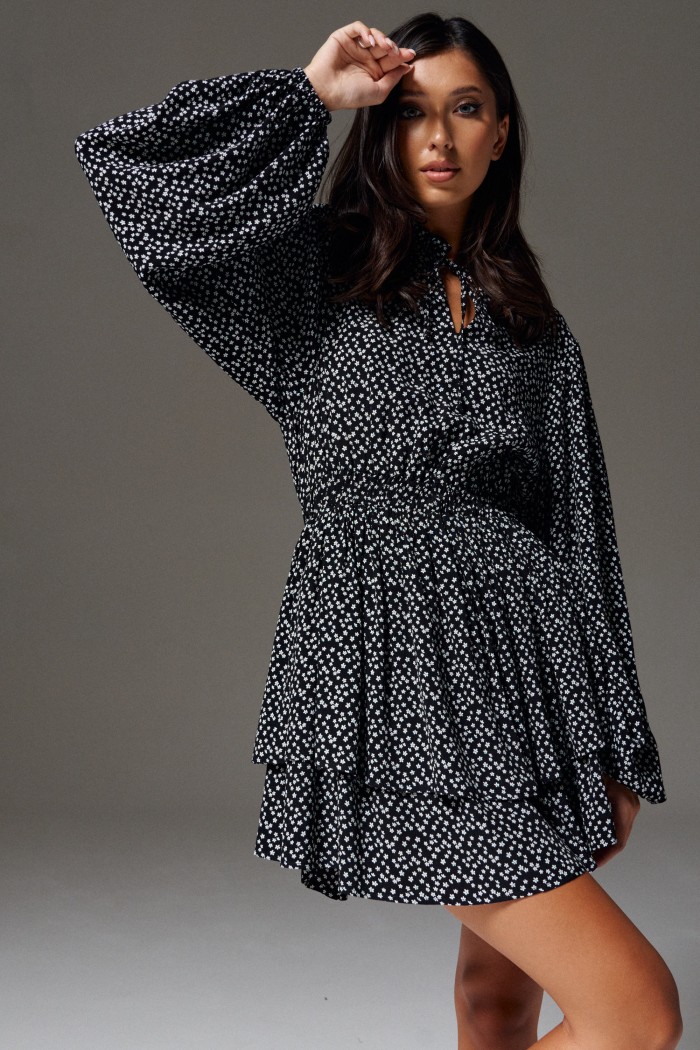 Платье полуприлегающего силуэта выполнено из чёрного полотна с цветочным принтом.