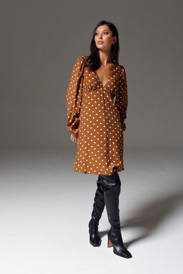 Платье полуприлегающего силуэта с фигурным отрезом выполнено из ткани цвета молочный шоколад с принтом горох.